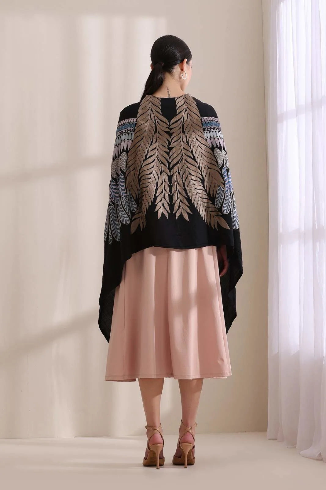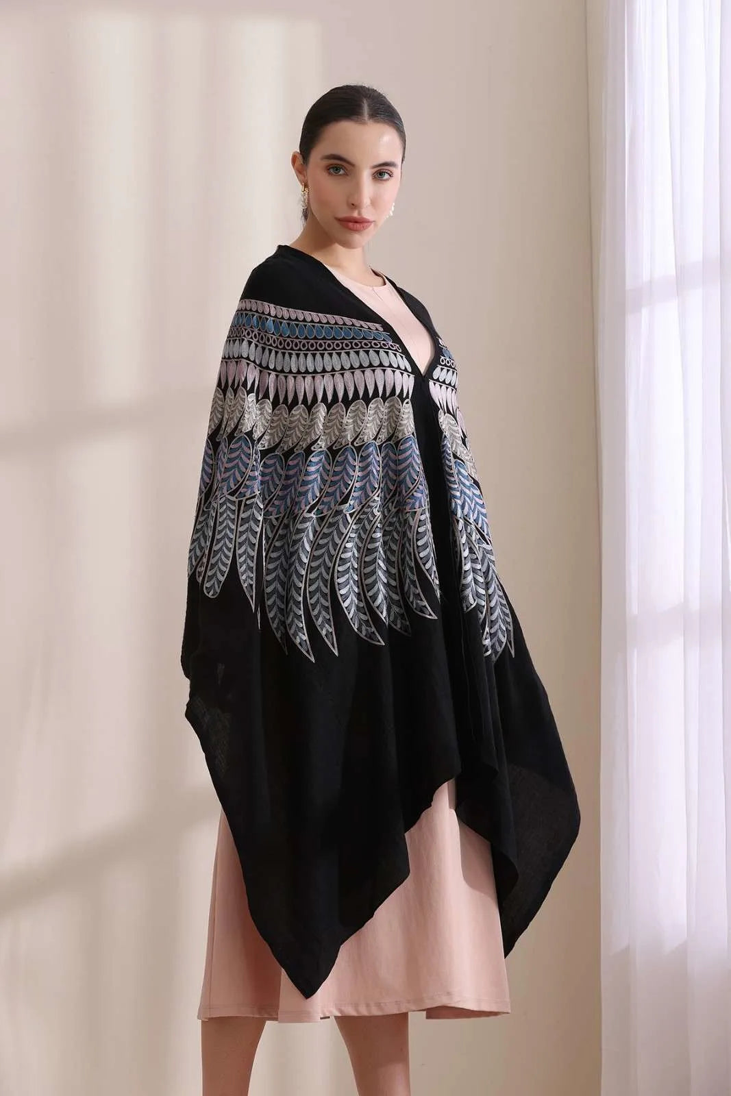 Elevate any outfit with this Birdie feathered embroidered fine wool cape. Crafted from luxurious, lightweight wool, it features striking bird-inspired feather embroidery in subtle hues, creating an elegant statement look. The soft drape and flowing silhouette add warmth and sophistication, perfect for both special occasions and everyday chic ensembles.