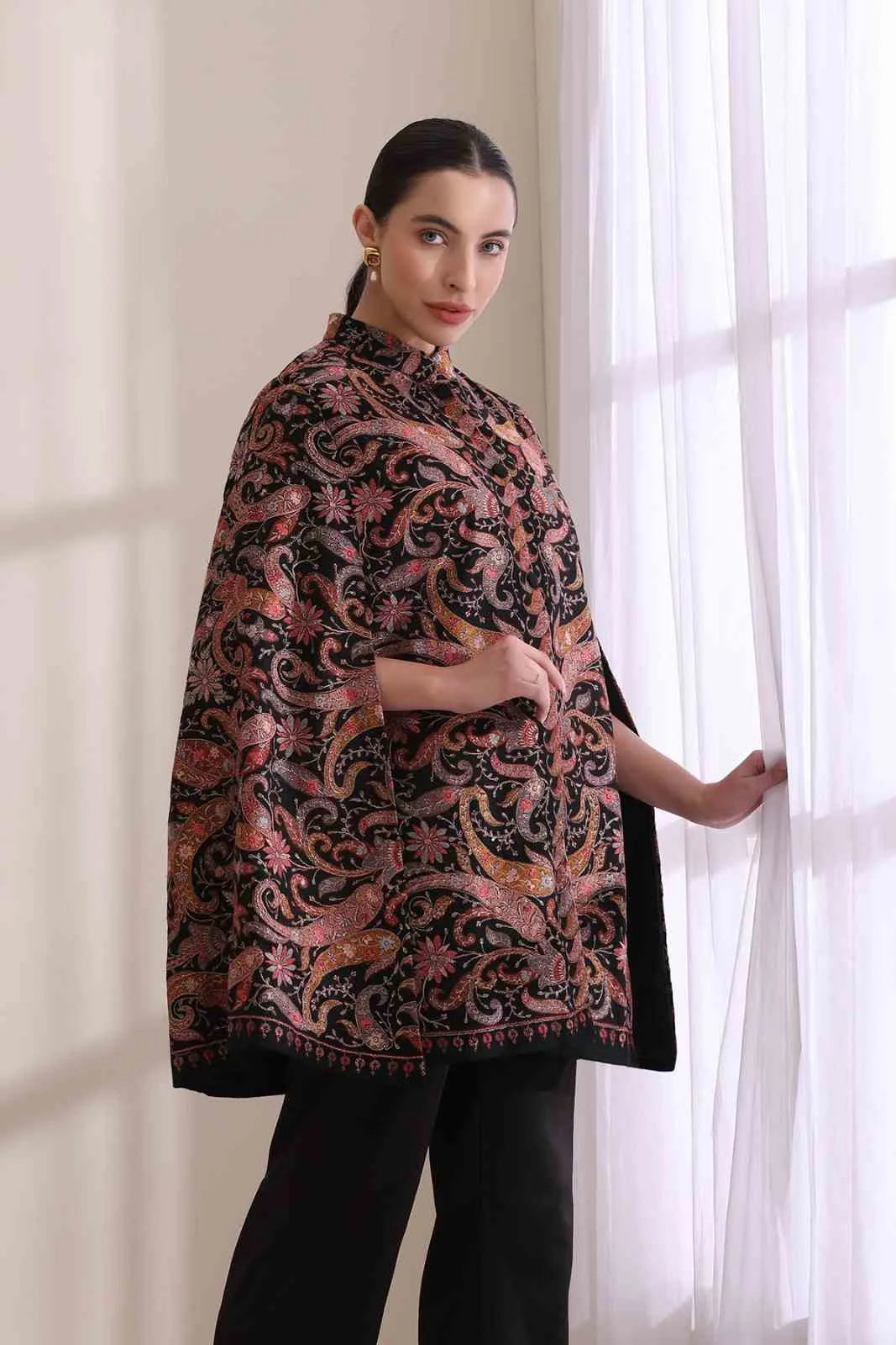 Emery embroidered cape features exquisite floral motifs in vibrant red and multicolor threads on a black base. Tailored with a structured silhouette and front button closure, this statement piece blends traditional craftsmanship with modern elegance, making it perfect for festive occasions or elegant evenings. A timeless luxury addition.