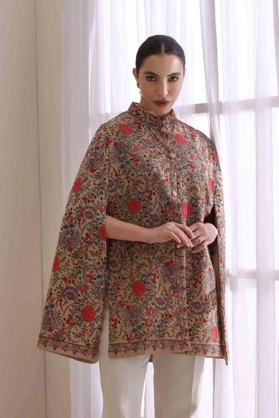 The Gulab embroidered cape features exquisite floral motifs in vibrant red and multicolor threads on a neutral base. Tailored with a structured silhouette and front button closure, this statement piece blends traditional craftsmanship with modern elegance, making it perfect for festive occasions or elegant evenings. A timeless luxury addition
