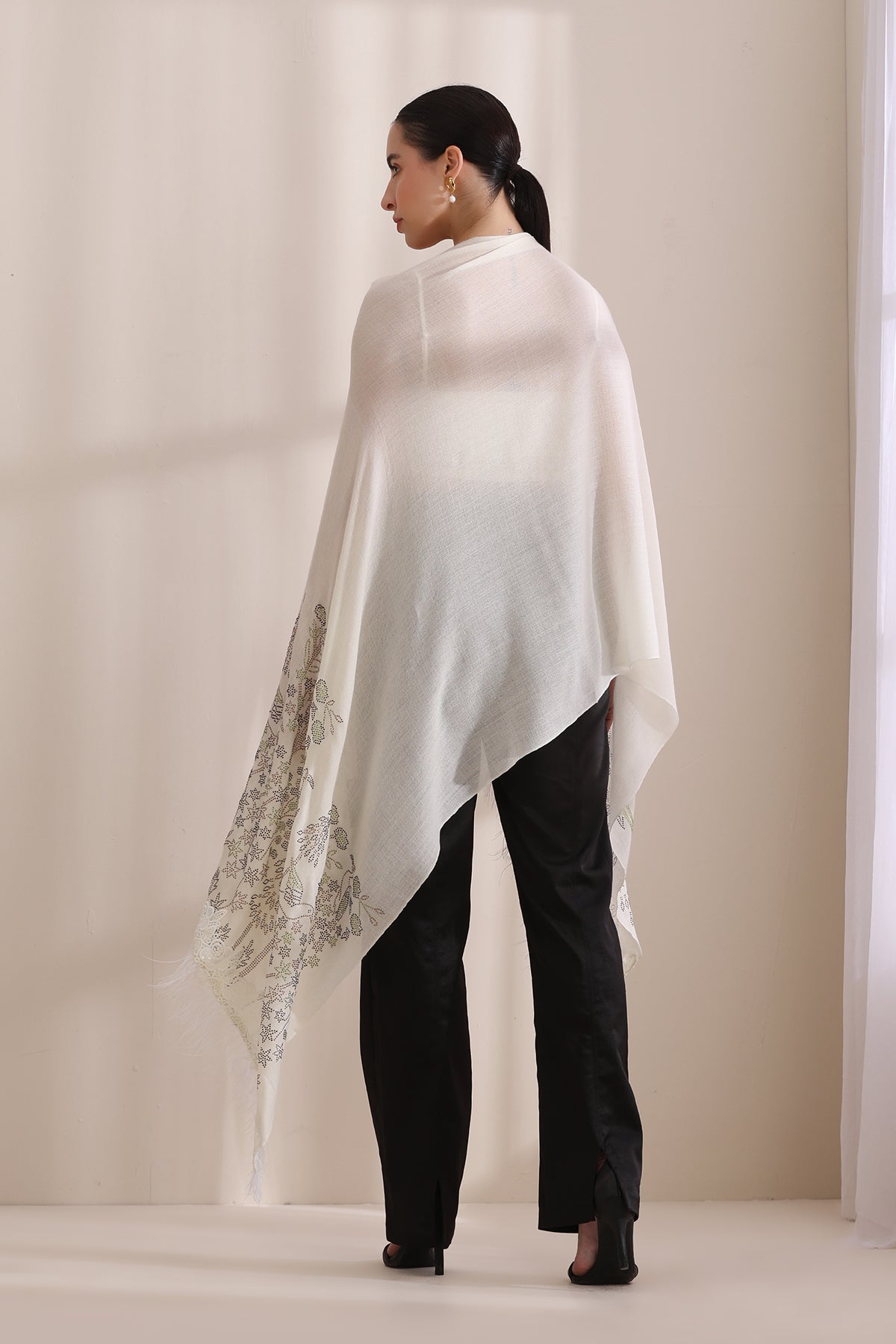 Discover timeless elegance with this ivory stole, showcasing intricate tree-inspired embroidery in earthy brown and pastel green threads. The stole is finished with luxurious floral lace and soft feather fringes, blending tradition and contemporary style. Ideal for festive occasions, thoughtful gifting, or refined daily winter wear.