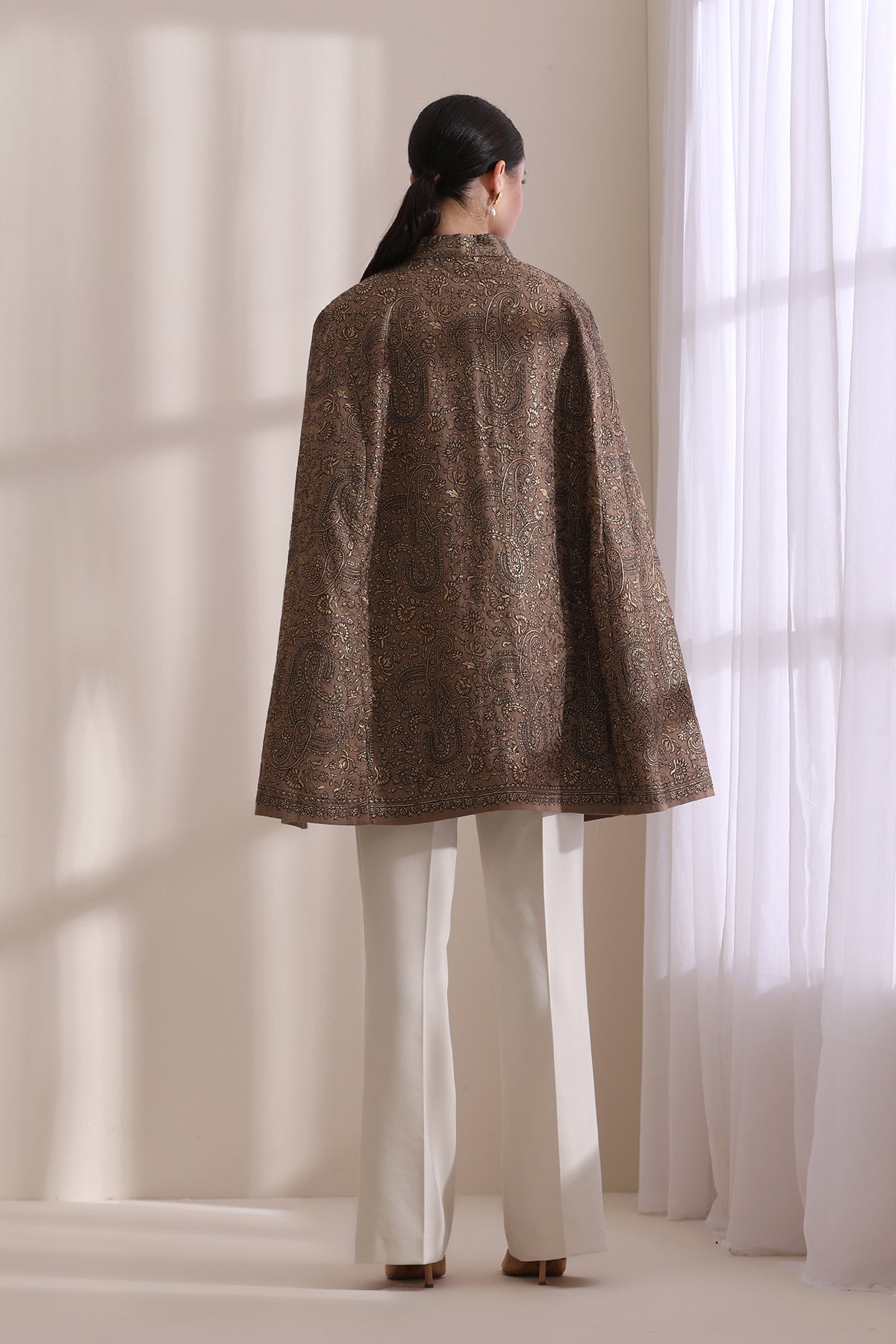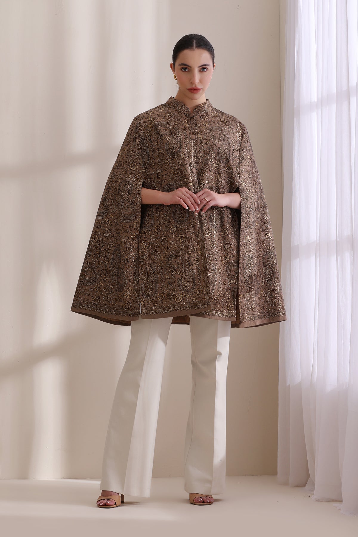 The Sanjh embroidered cape features exquisite paisley motifs in black gold zari threads on a brown base. Tailored with a structured silhouette and front button closure, this statement piece blends traditional craftsmanship with modern elegance, making it perfect for festive occasions or elegant evenings. A timeless luxury addition. Â Â