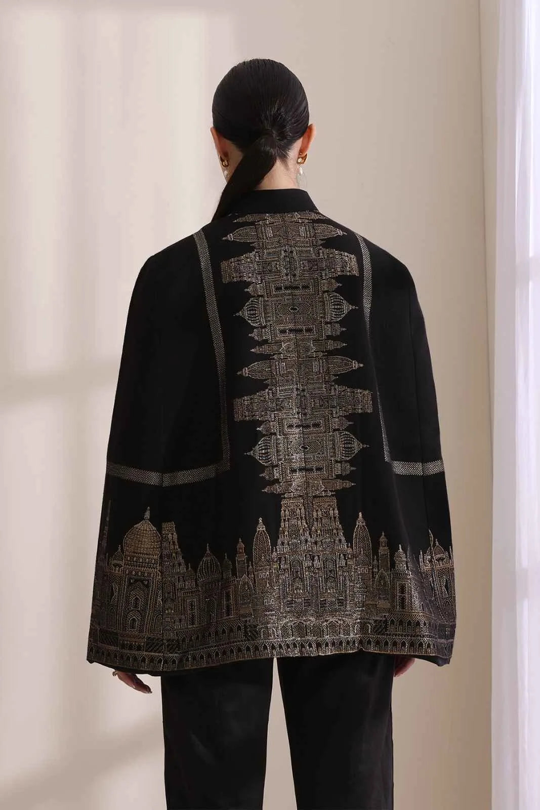 Taj exudes luxury and grandeur. This cape, crafted from the finest wool silk blend and Tajmahal woven with zari, showcases a stunning interplay of texture and design. The intricate Zari work highlights the rich tradition of craftsmanship, making it a versatile and sophisticated addition to any wardrobe.
