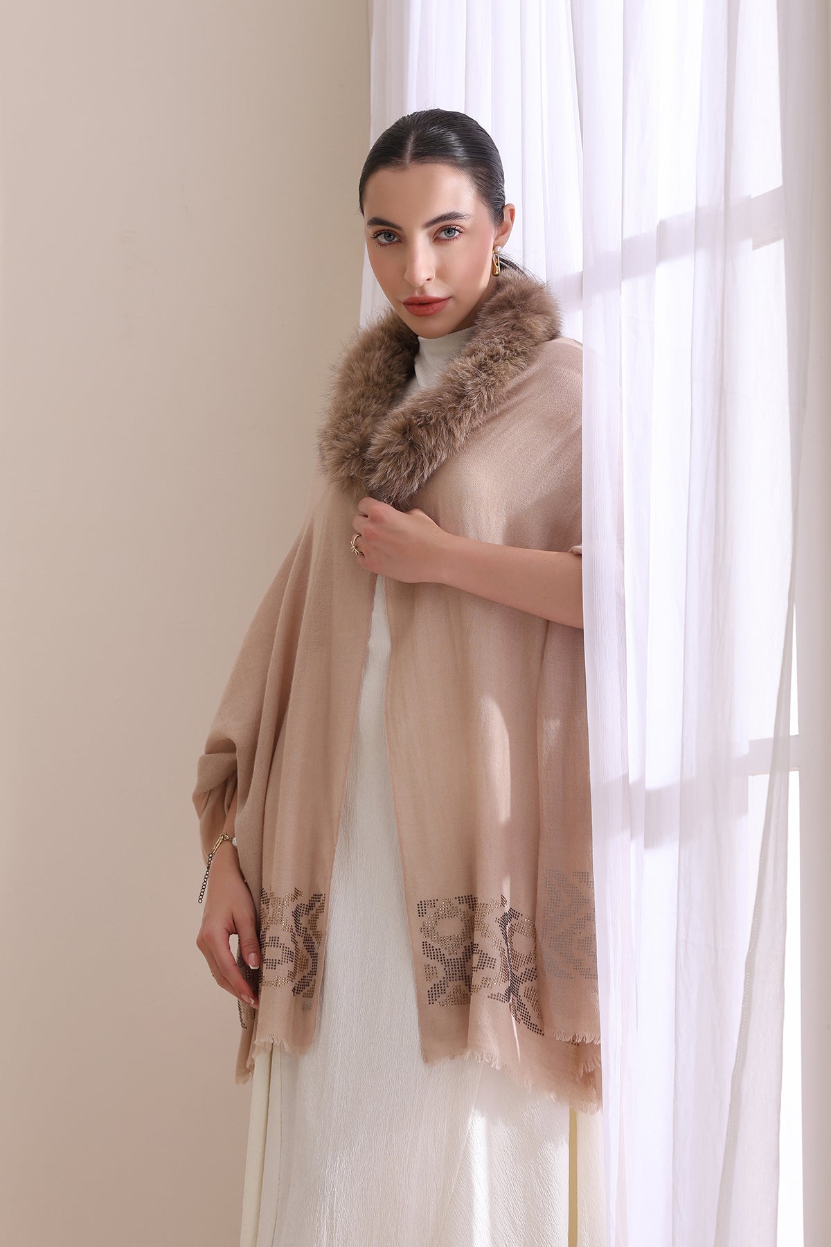 Wrap up warmth and elegance with this beige stole, featuring a luxe faux fur collar and geometric border. Perfect for gifting, it’s a thoughtful choice for birthdays, anniversaries, or festive celebrations—sure to delight anyone who appreciates cozy style