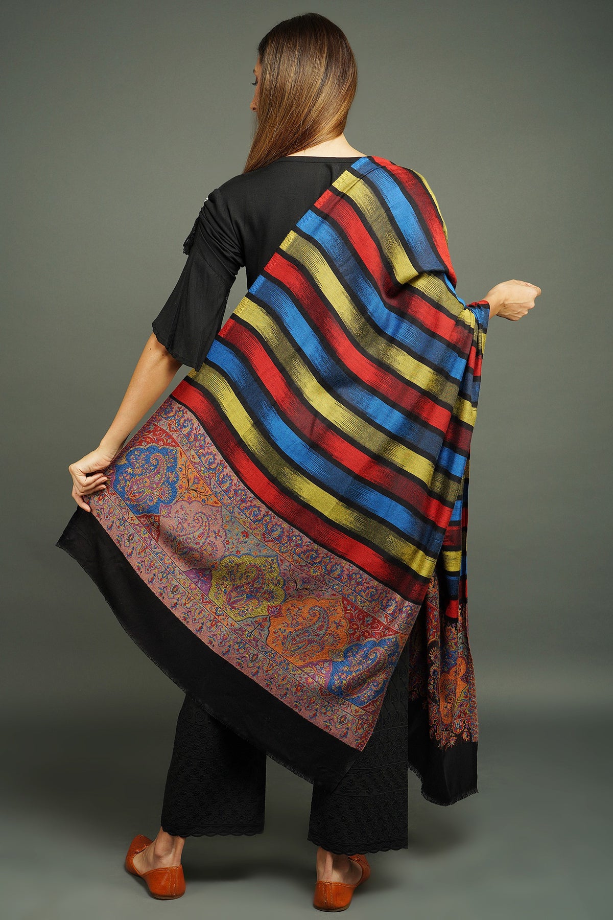 This Pashmina Blend full shawl with multicolor woven border design has a serne of texture and hand feel. Exclusively for your fine taste. This soft, warm, light-weight, smooth Shawl will level up your Stylistic game with ease. Pair it with any outfit, Occasions and the stole size 28x80.