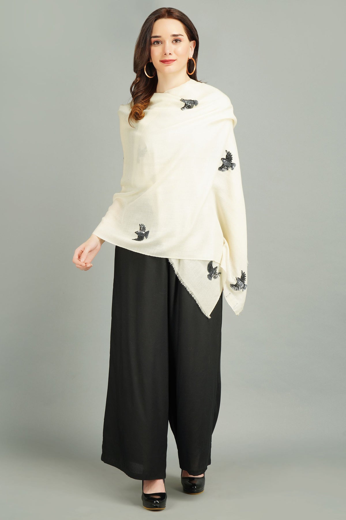 This 100% cashmere wool stole, Woven by hand and 3D Eagle sequence pipe work will enhance your look with any of your outfits. The fabric is warm and soft , and will make you feel Young and stylish. The stole size is 28x80.