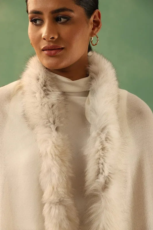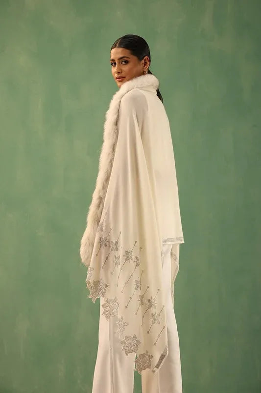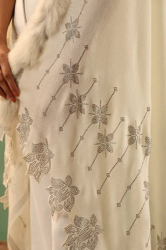 The Marina fur stole, made from white Cashmere Fine Wool, boasts one-sided fur and stone work. It merges luxury and style for a refined accessory.