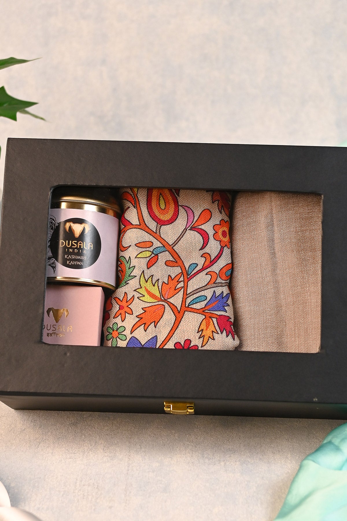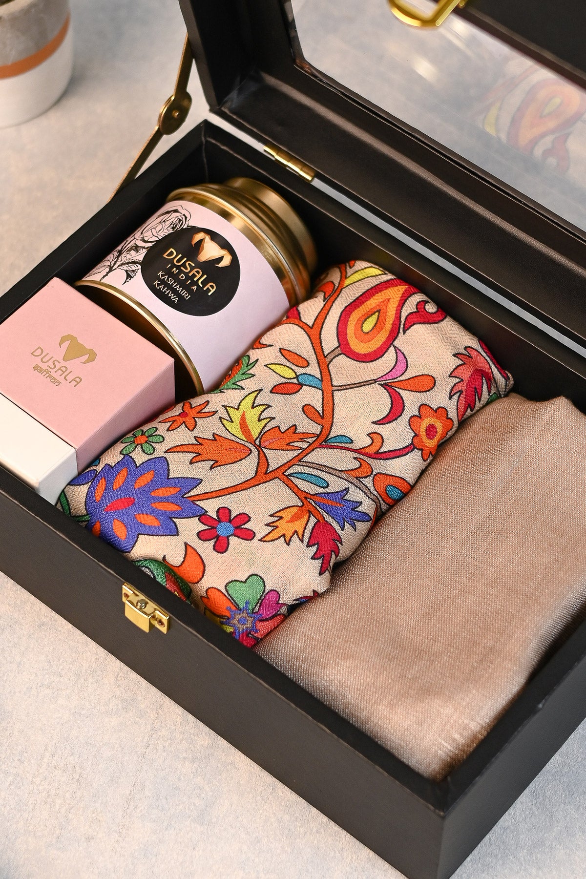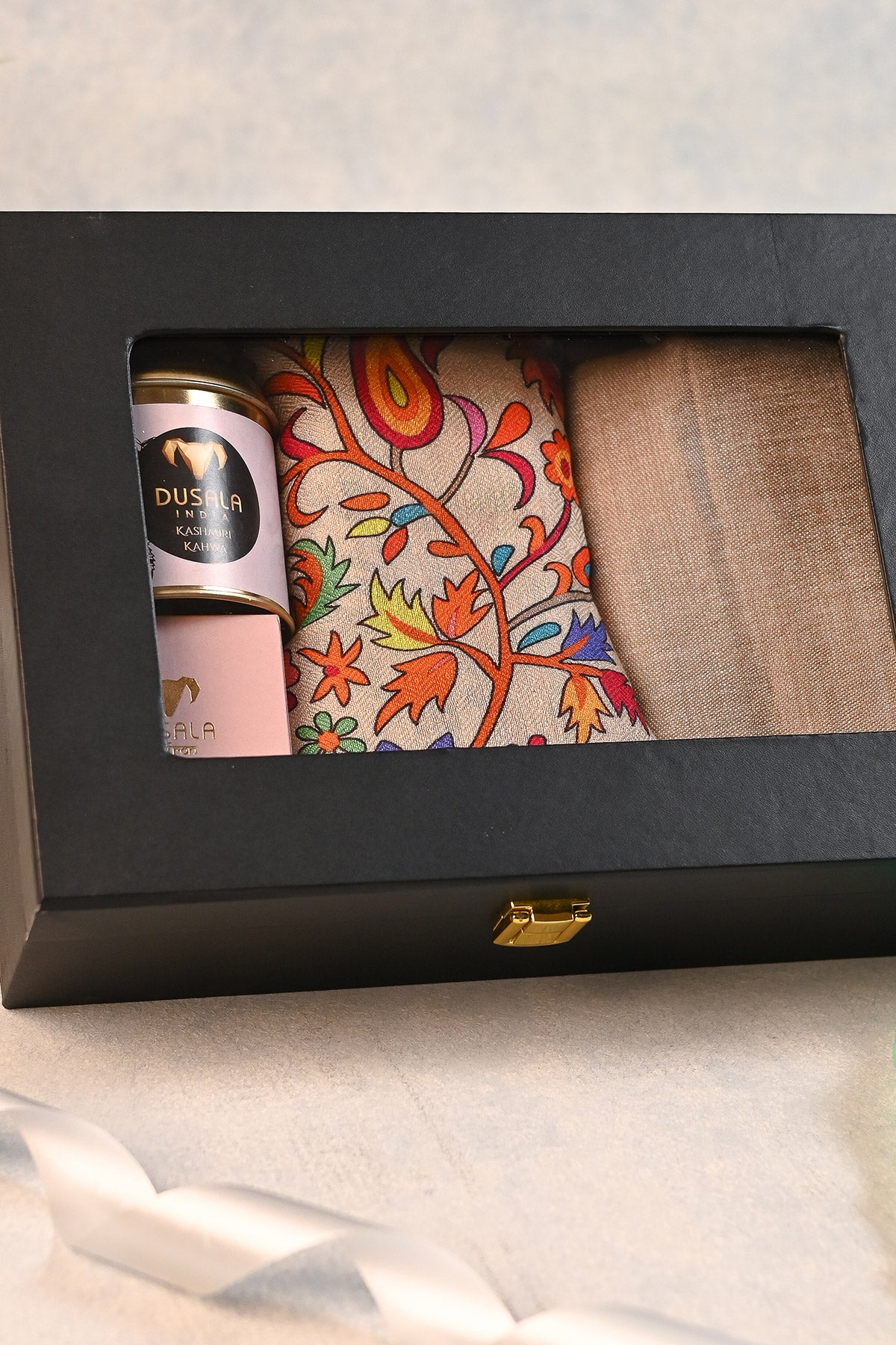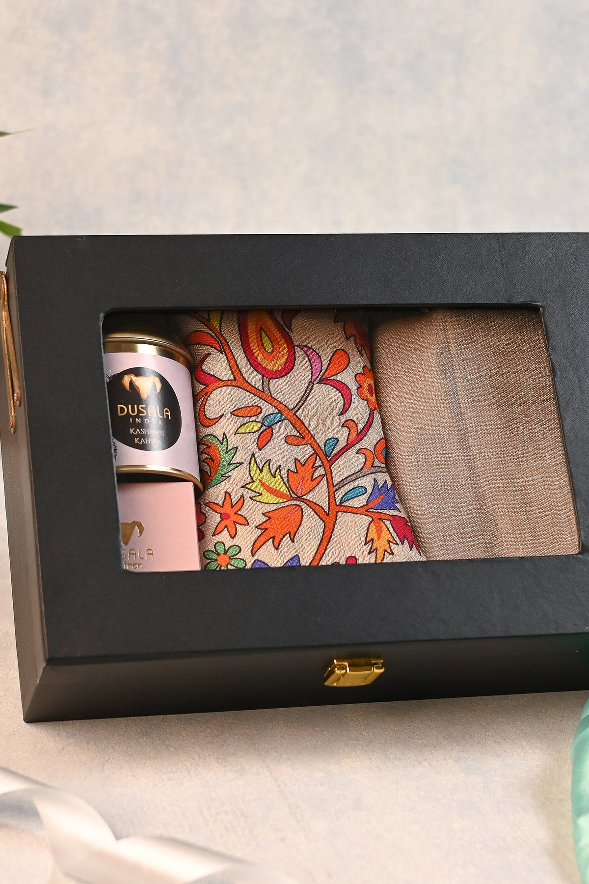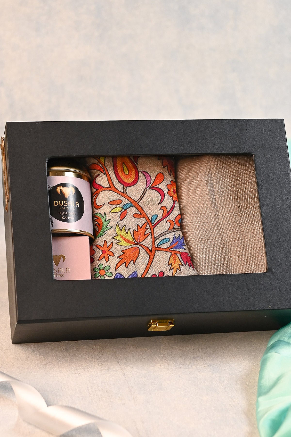 Components - 2-Stole, 1-Kahwa & 1-KesarNote - Gift samples are just for reference purpose product design and color may vary.Will take approval after order confirmation or at the time of query.