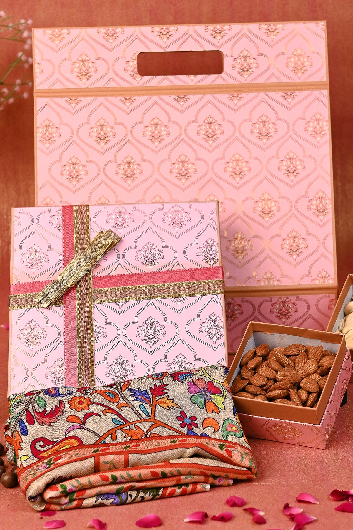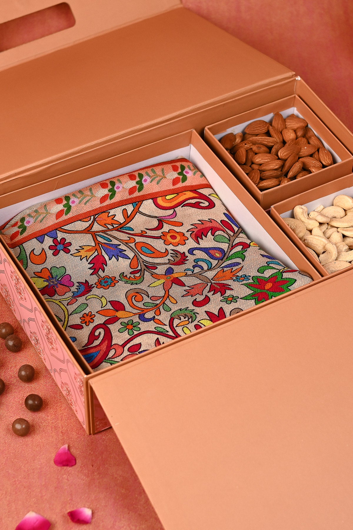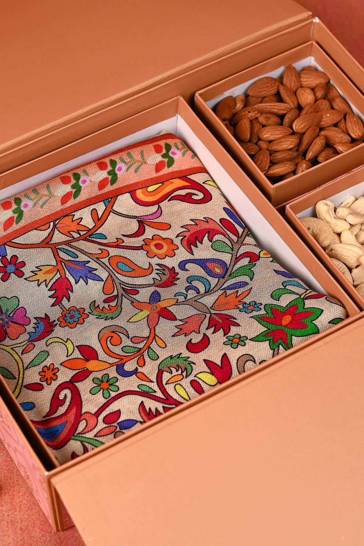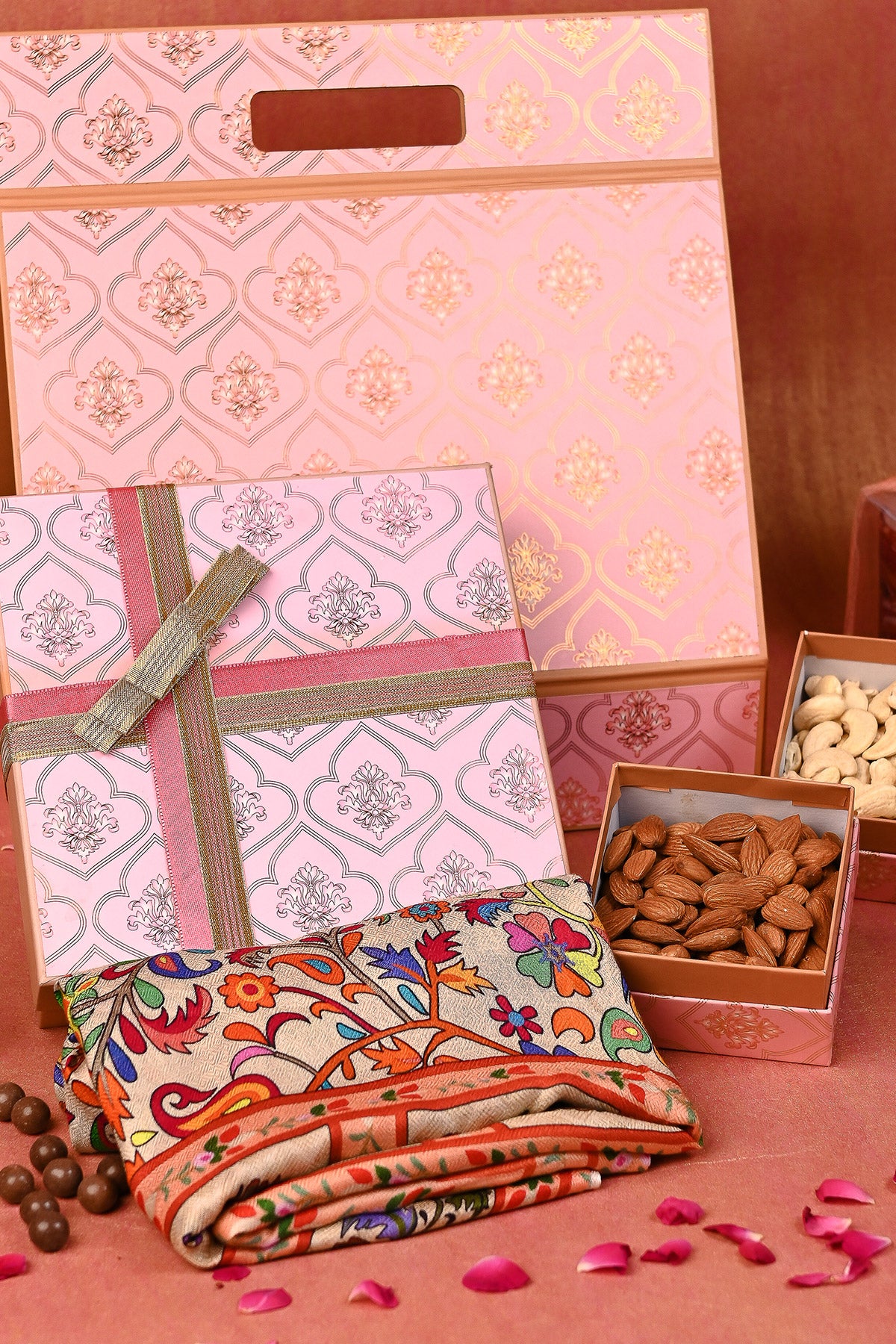 Components - 1-Stole, 1-Kahwa & DryfruitsNote - Gift samples are just for reference purpose product design and color may vary.Will take approval after order confirmation or at the time of query.