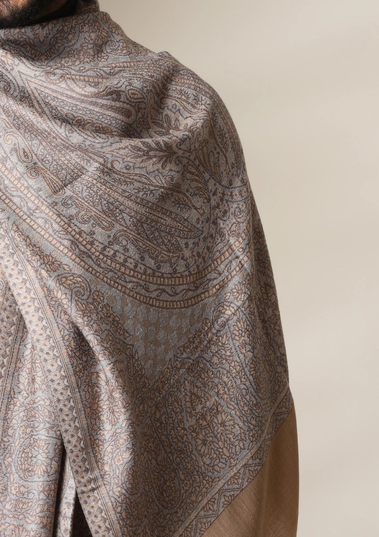 The Dusala Mocha Maze Shawl combines understated luxury with rich craftsmanship. Its warm beige tones and intricate metallic detailing make it a perfect unisex statement piece, ideal for festive gatherings, elegant evenings, or refined gifting.