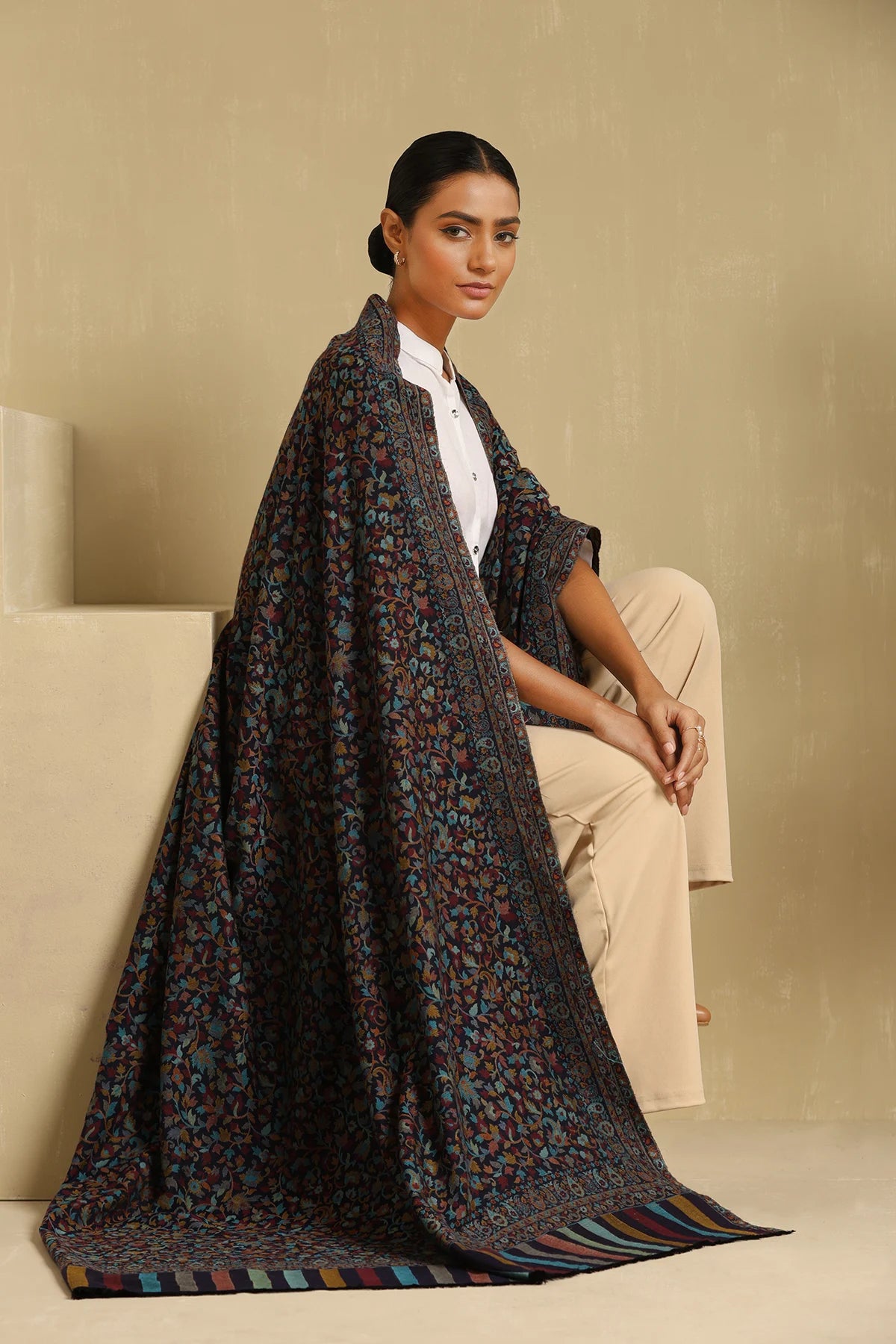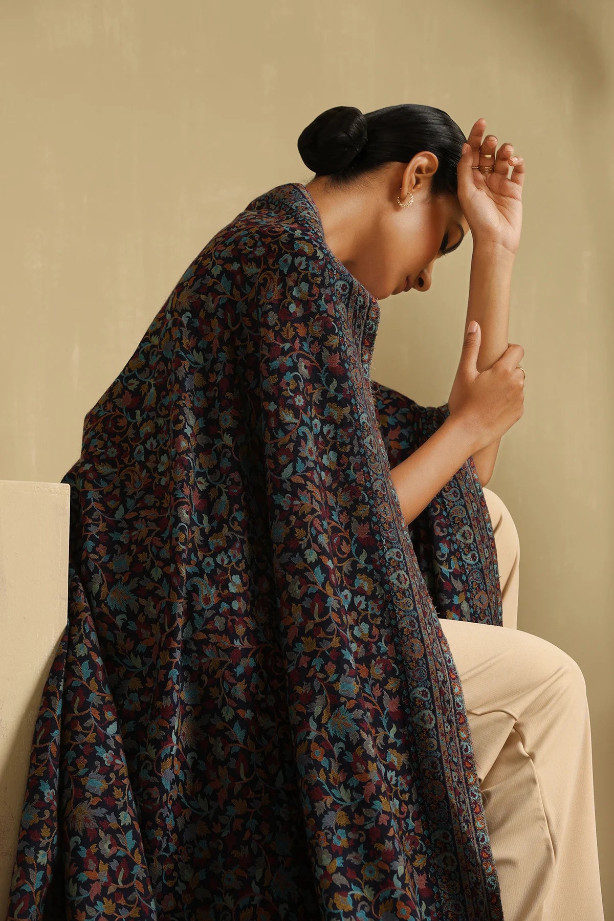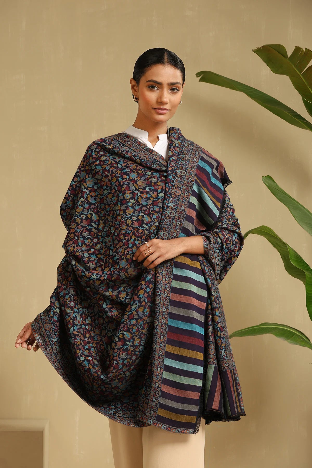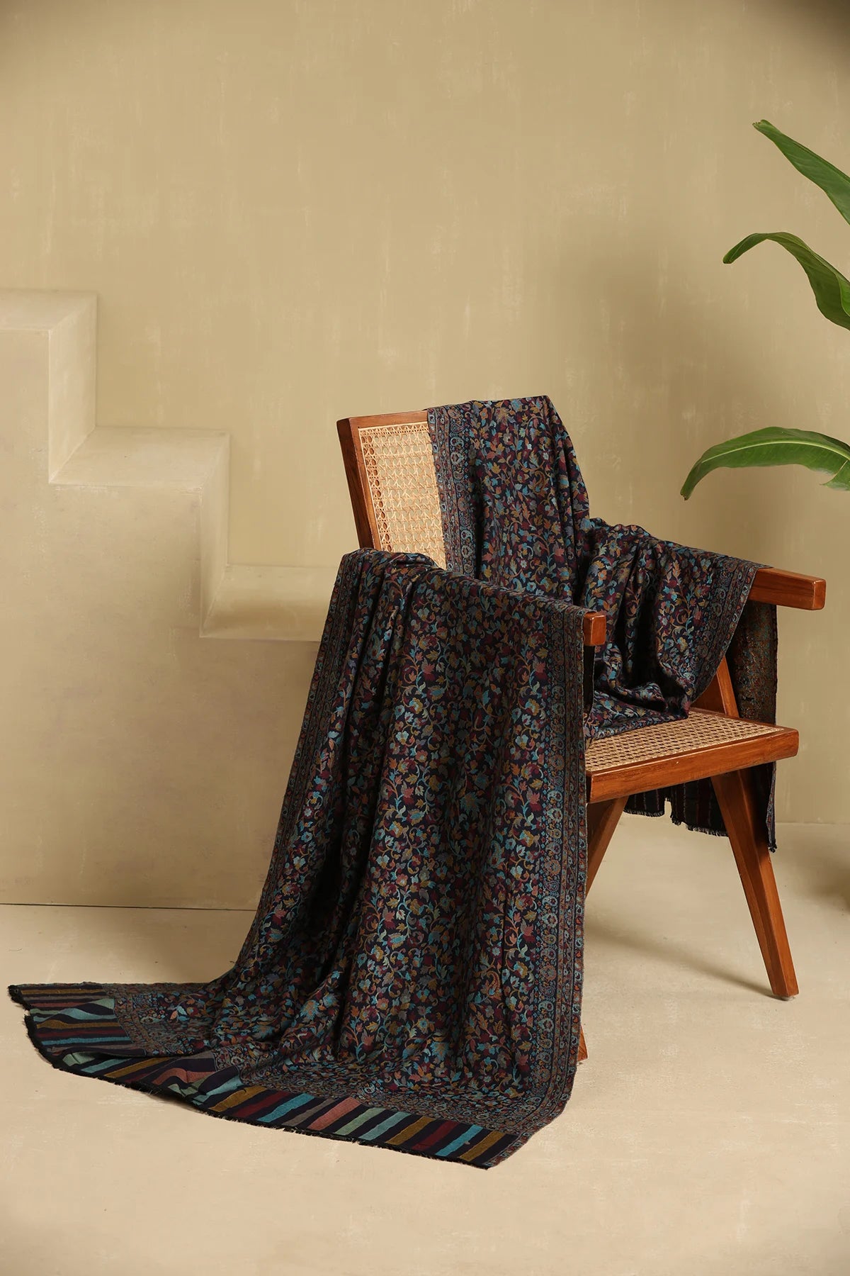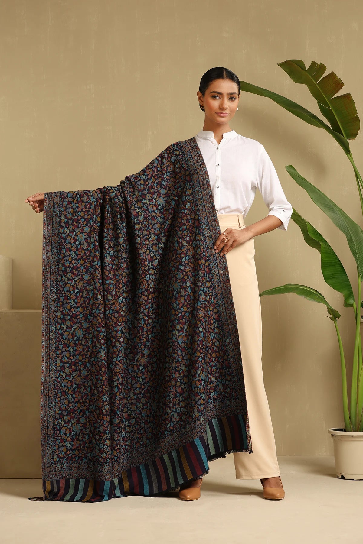 Adorn yourself with Ema cashmere fine wool shawl featuring a stunning intricate kani design in multi colored hues.