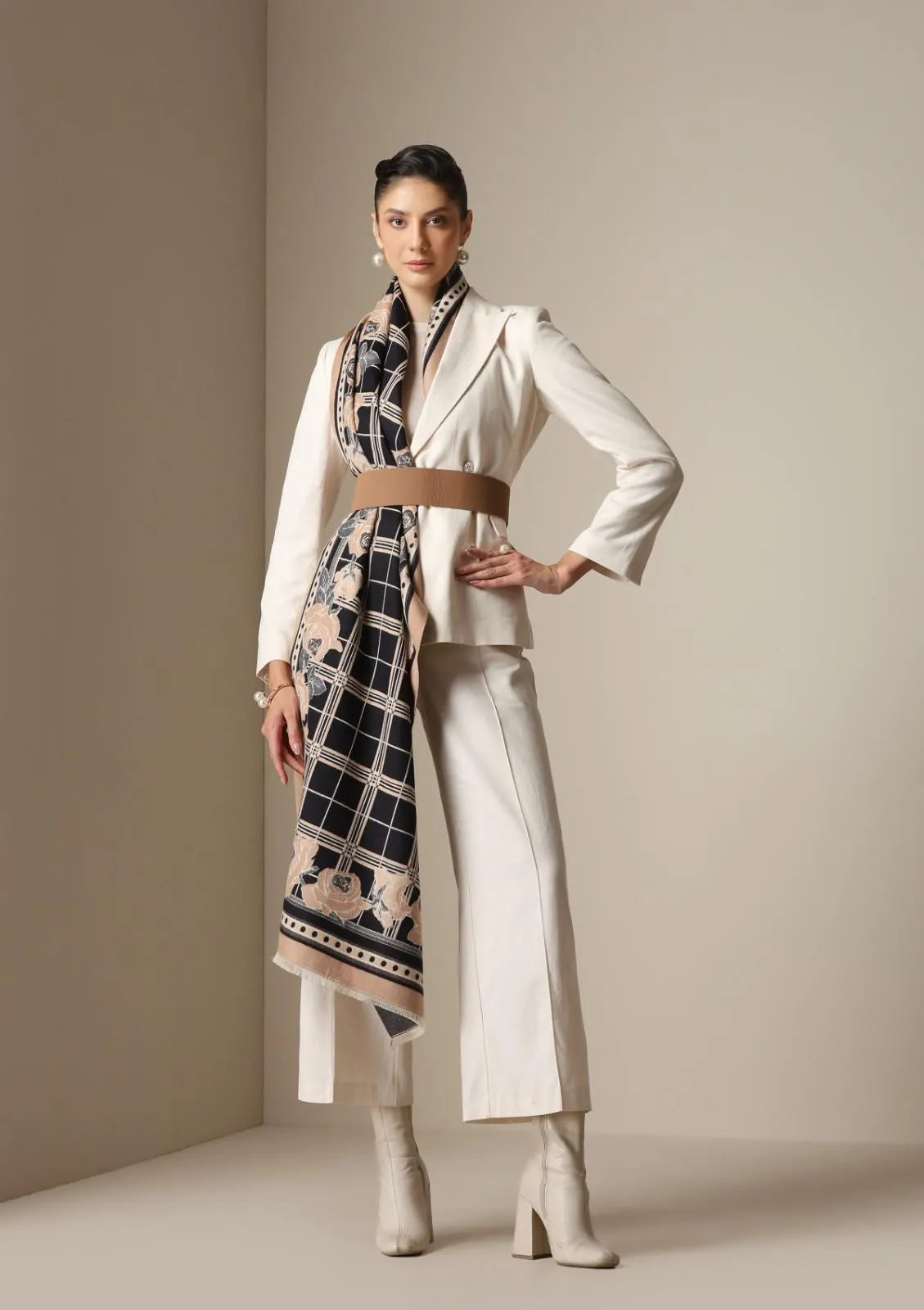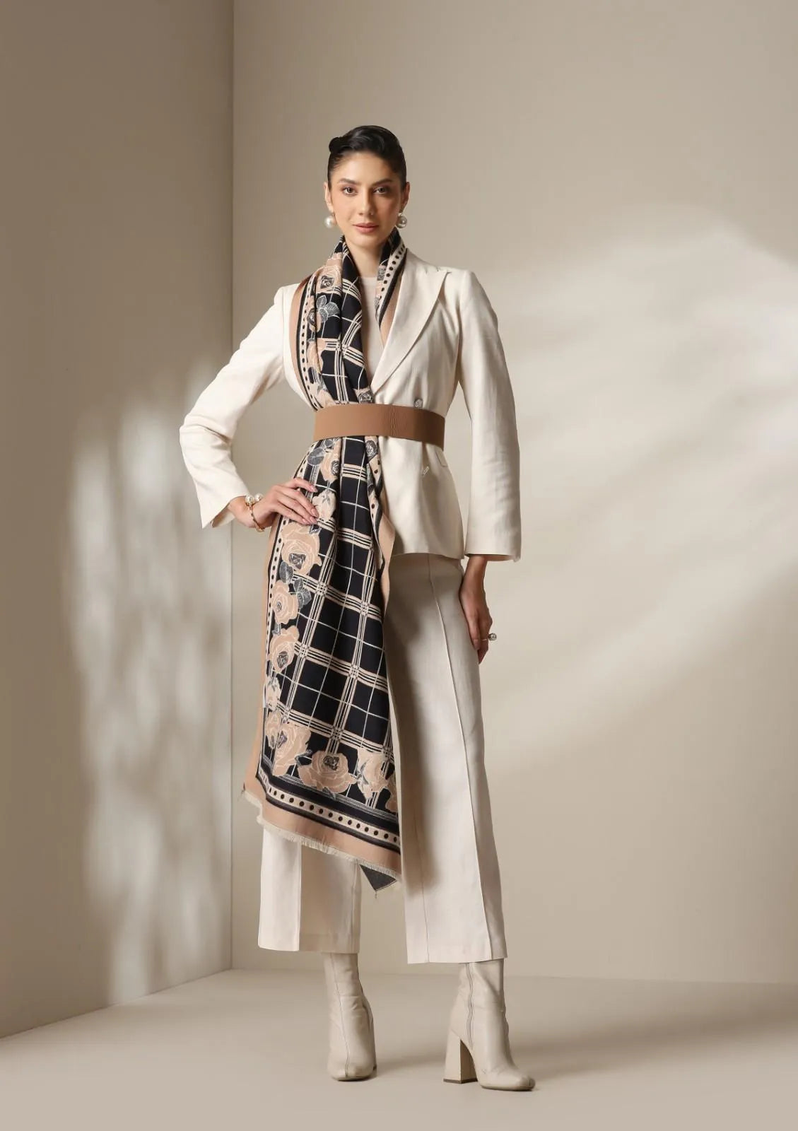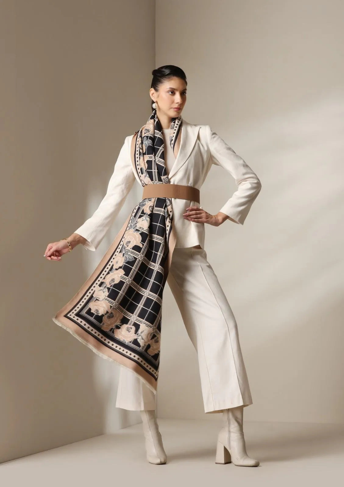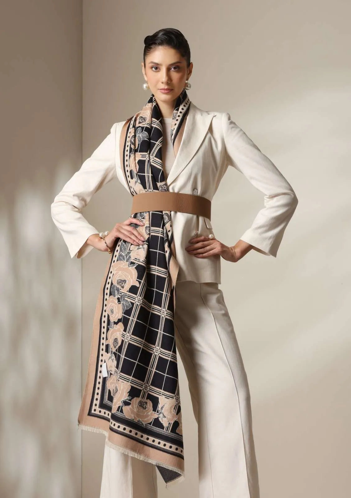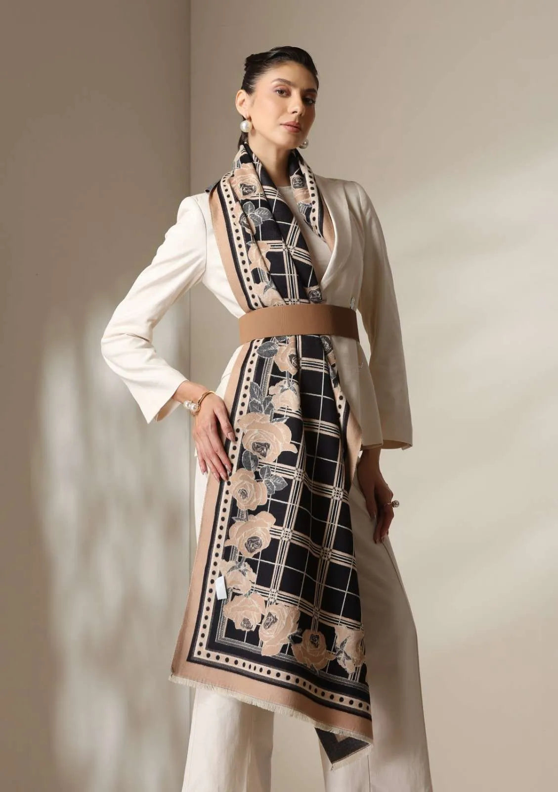 The Noir Rose Stoles from Dusala India is an embodiment of modern elegance with a touch of classic romance. The stole features a sophisticated black and beige checked base, beautifully framed with roses in muted mocha and ivory tones, an ode to timeless femininity.