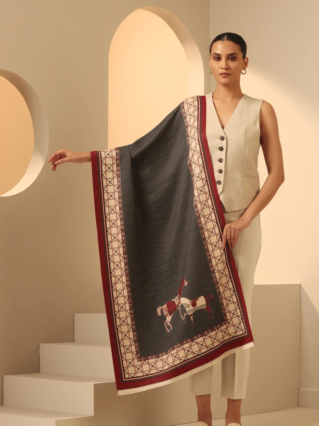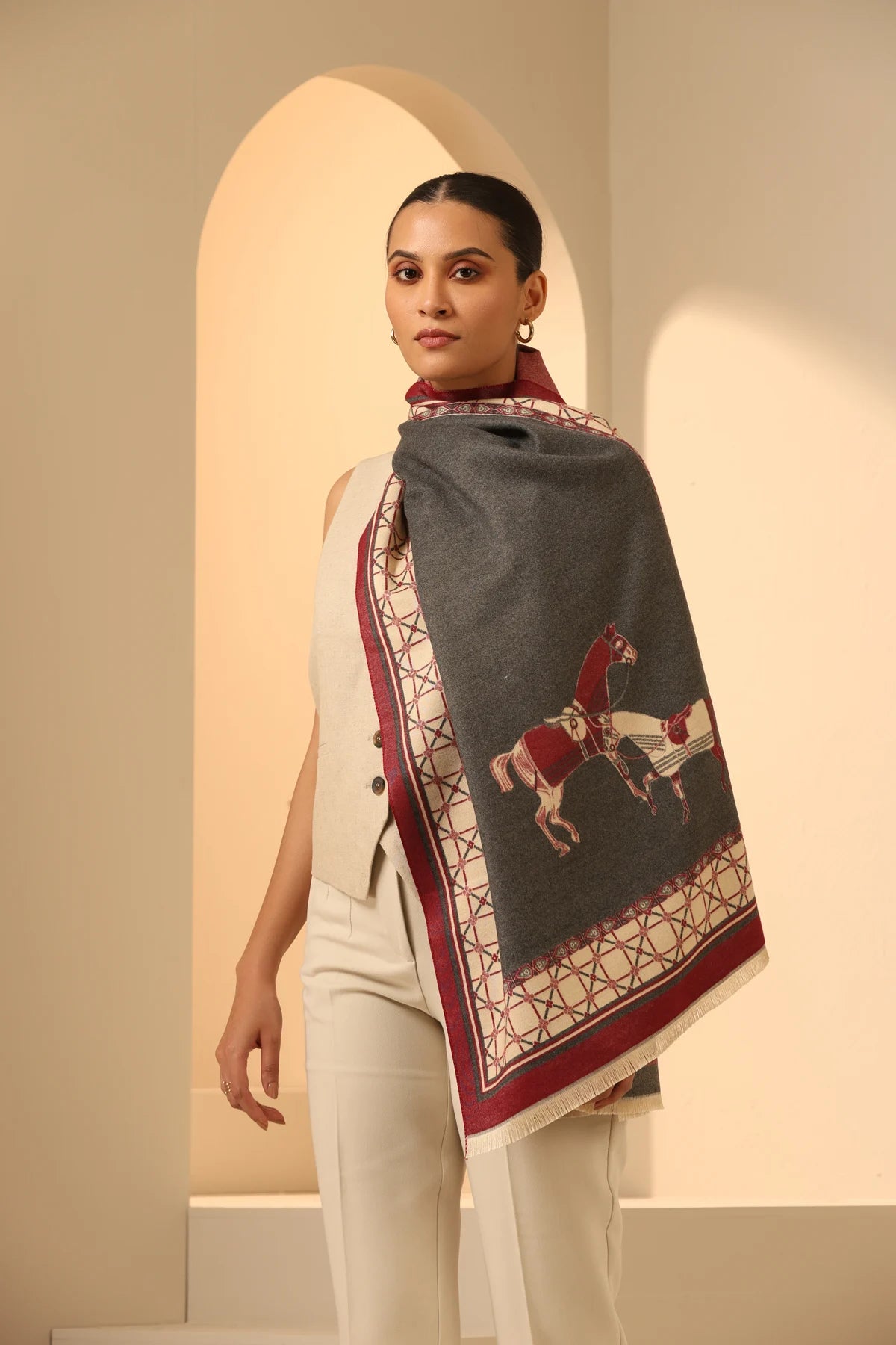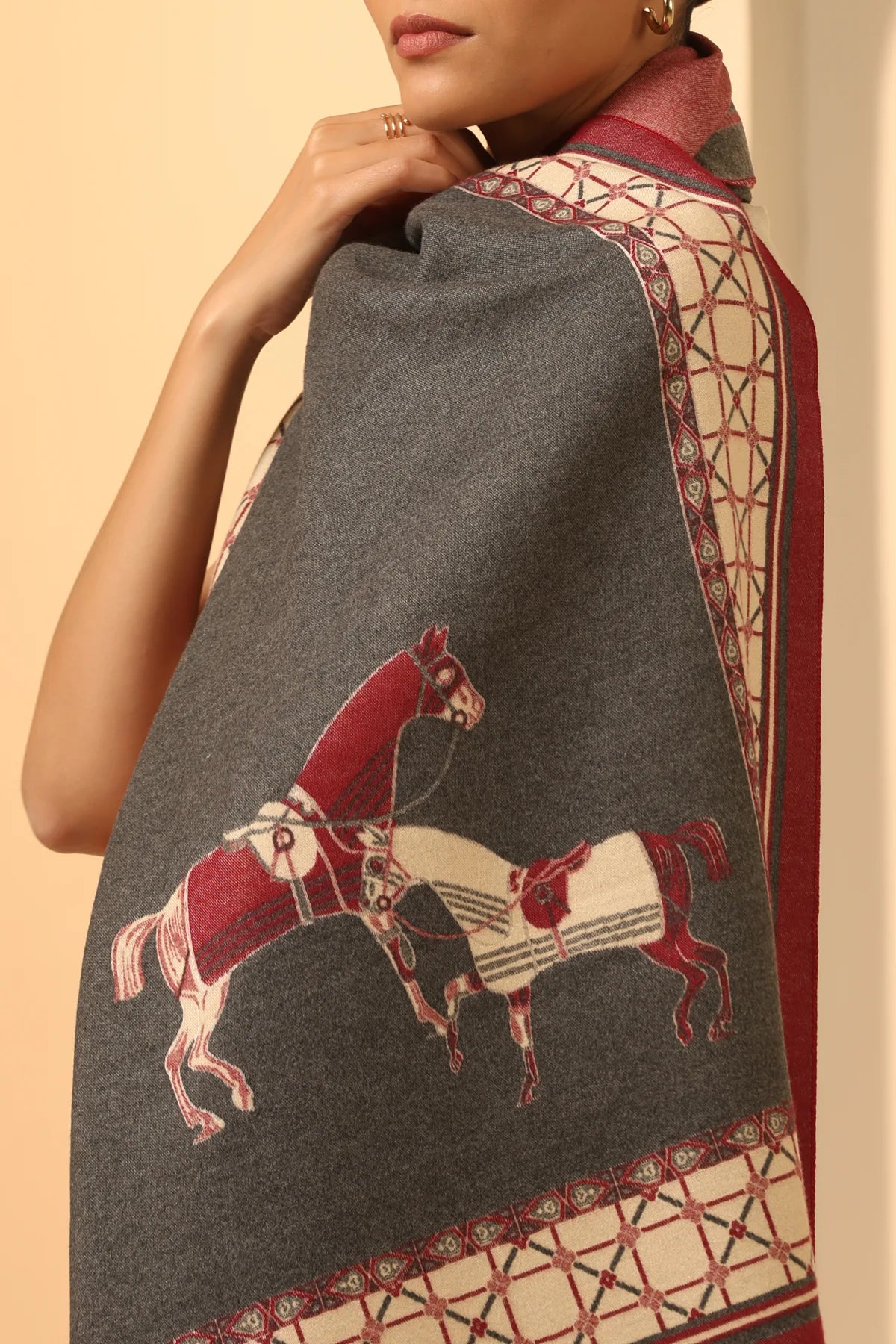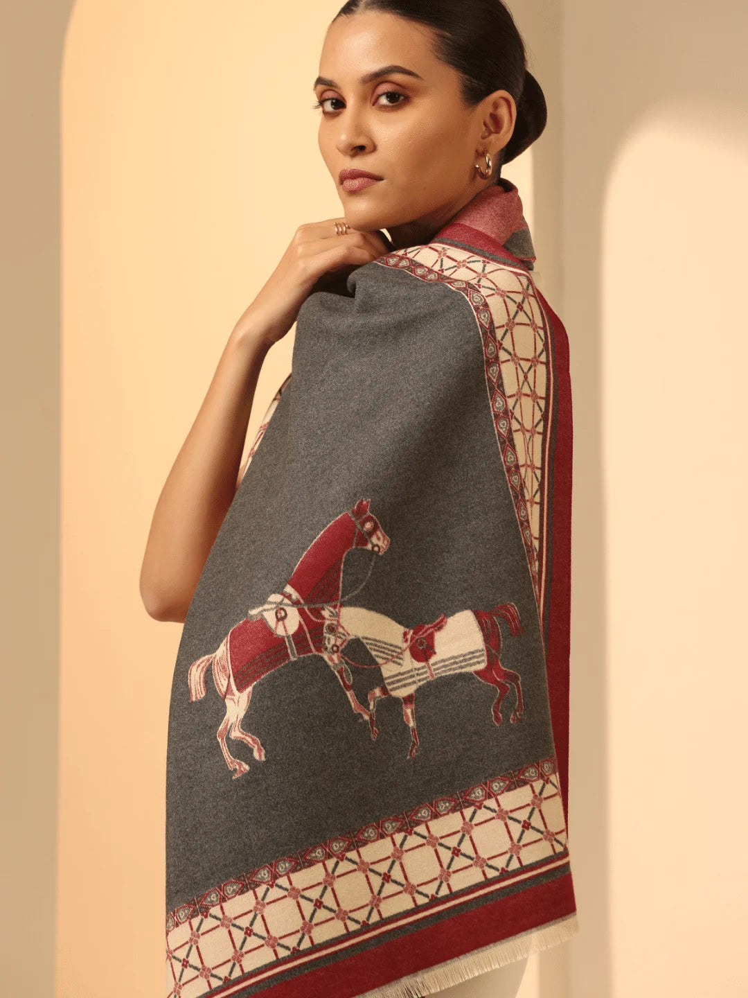 Explore the dark grey vegan cashmere stole, Olivia, featuring a stunning woven jacquard red and white horse design with an elegant red and white check border for a chic look. Get cozy with this soft elegance.