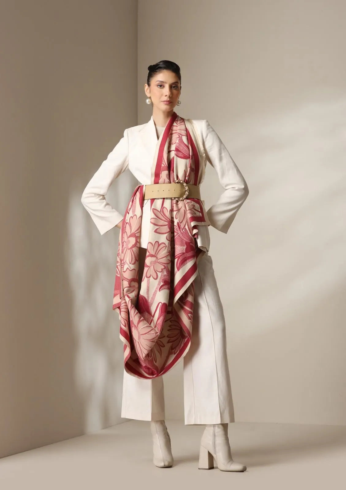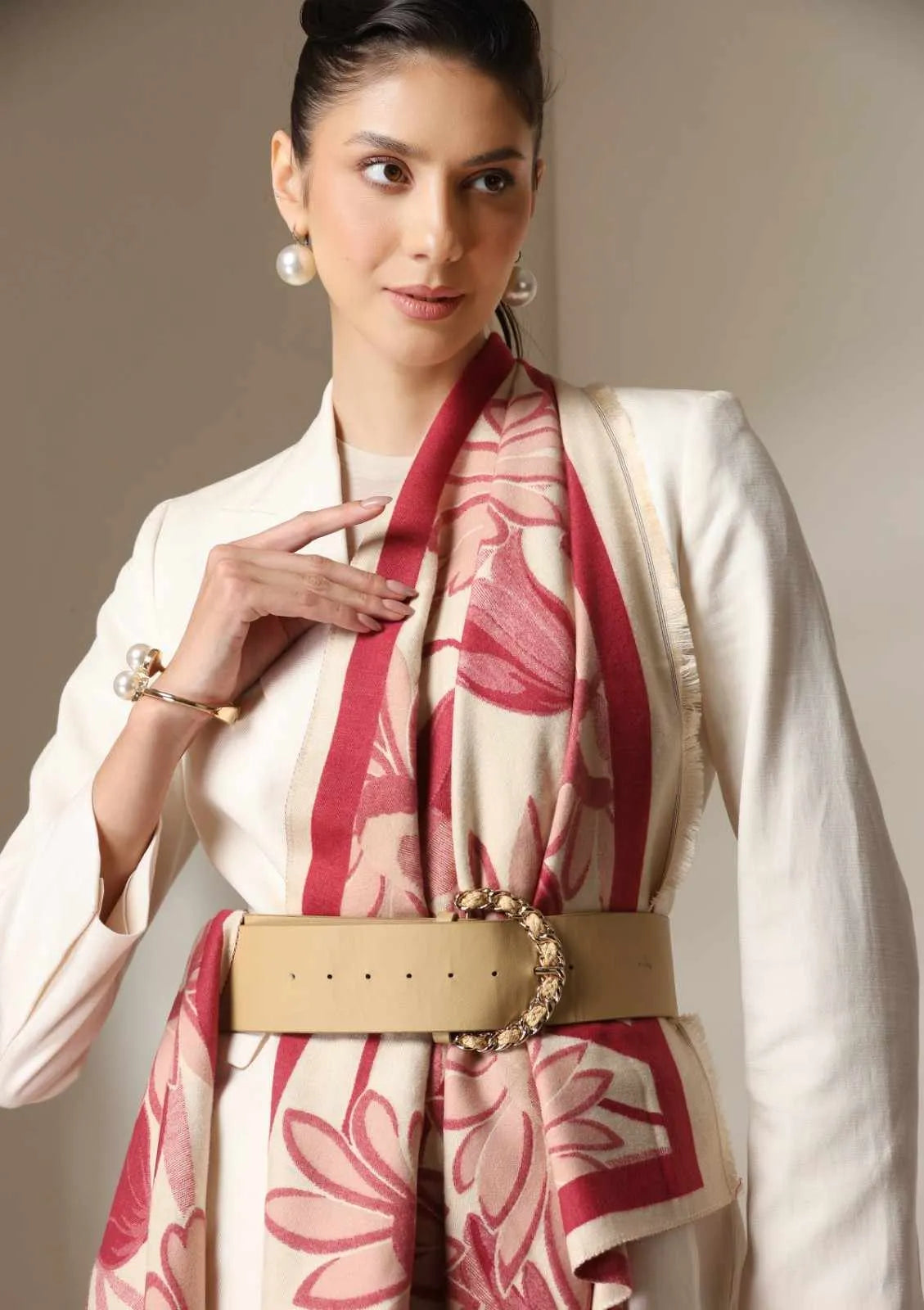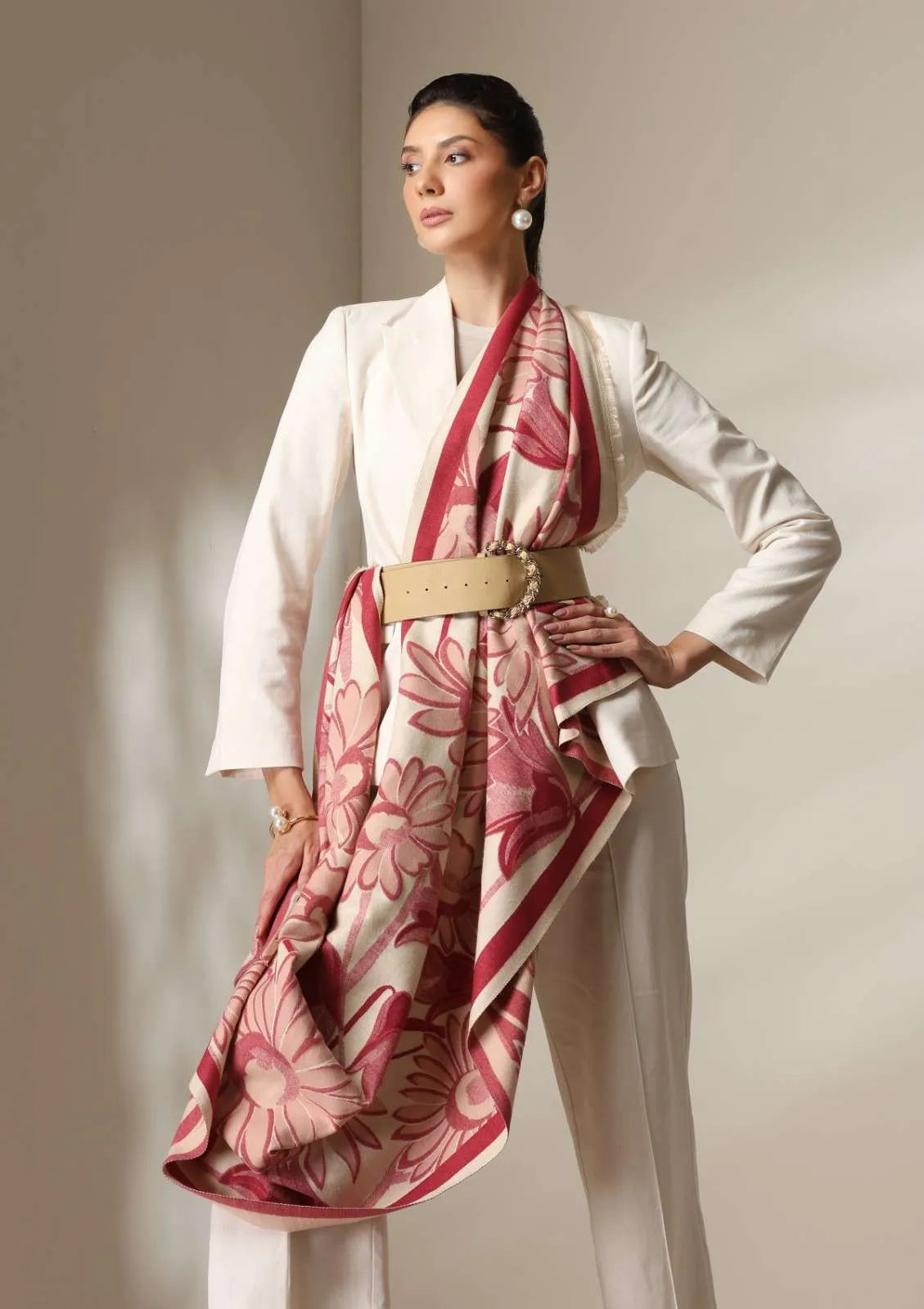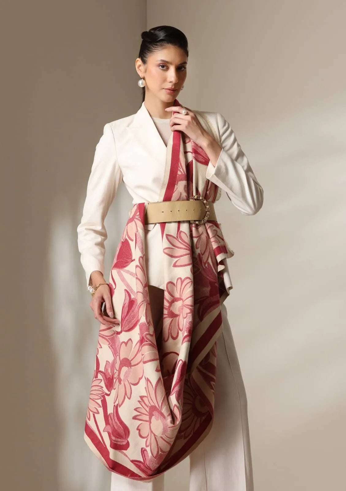 Woven from Dusala’s premium cashmere blend, this stole offers exceptional warmth, light drape, and breathable softness, making it ideal for year-round sophistication. The floral pattern adds a statement touch while remaining versatile enough to pair with neutral suits, winter coats, or evening ensembles.