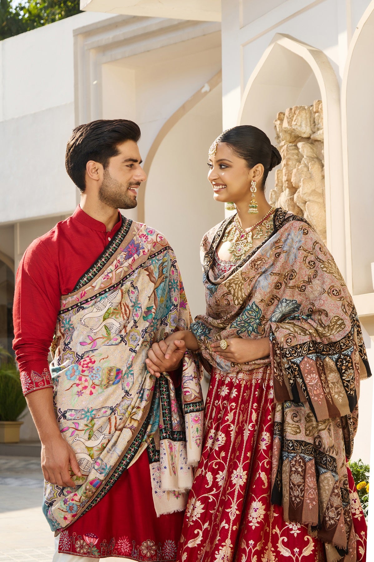 Indulge in vibrant luxury with the Tapi Pashmina Shawl. Handwoven pashmina wool meets exquisite Kalamkari Adda work, creating a stunning shawl draped in silk stories. Soft, warm, and lightweight