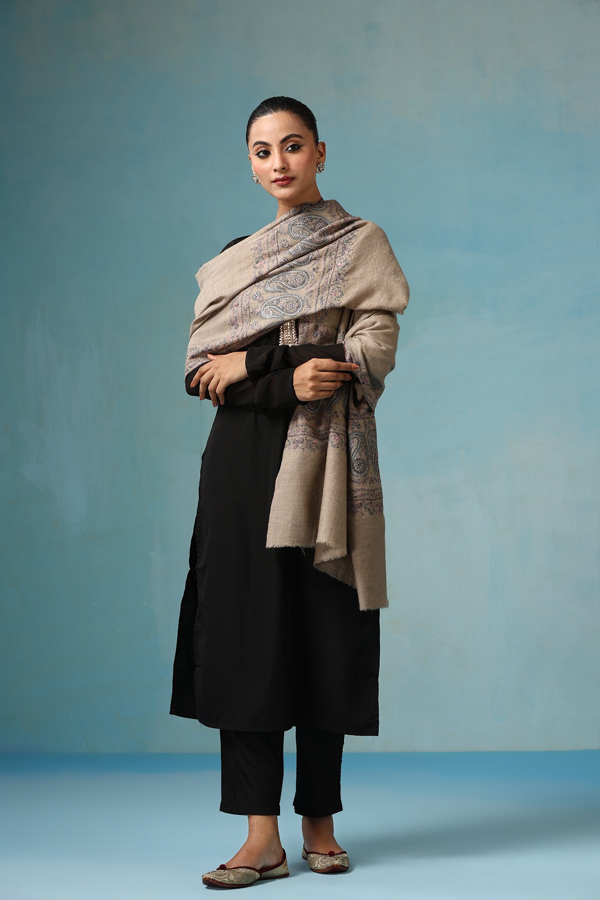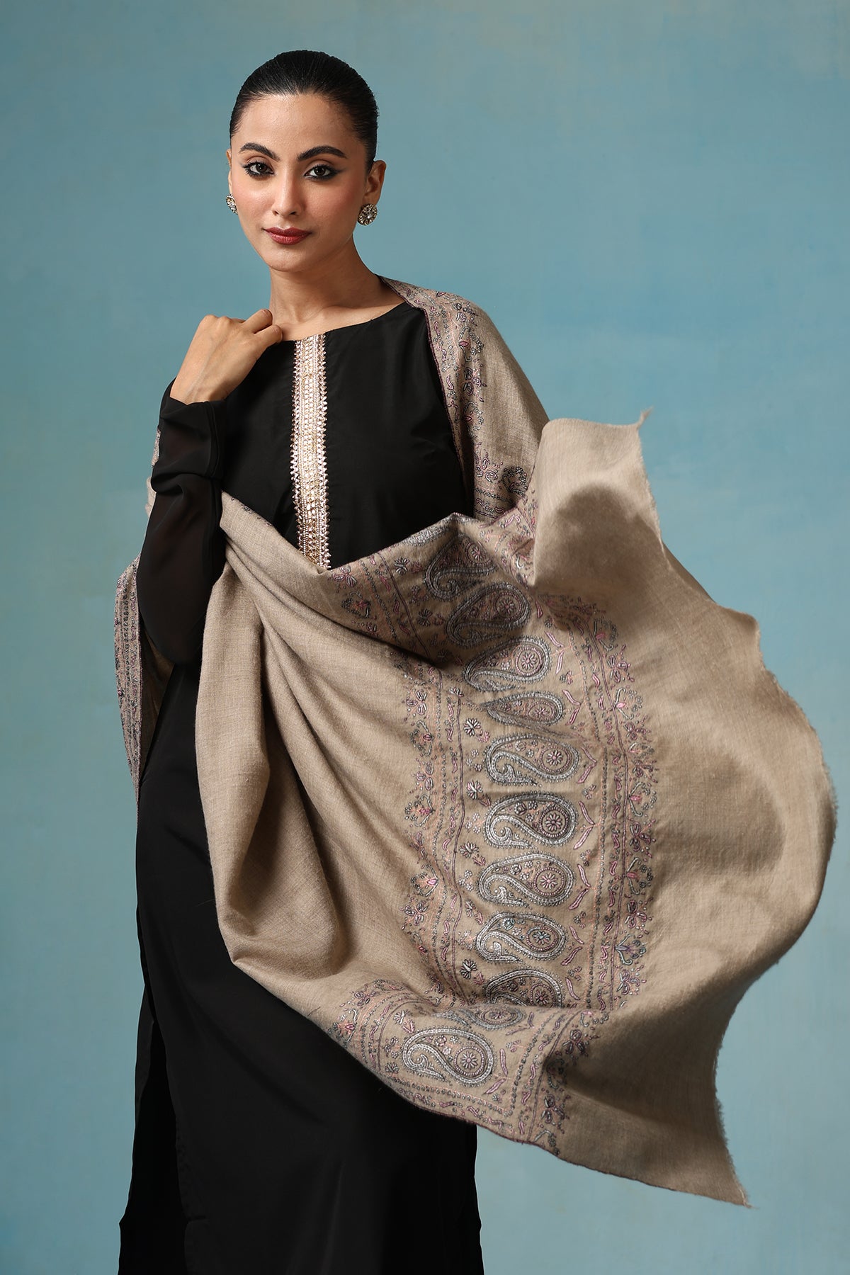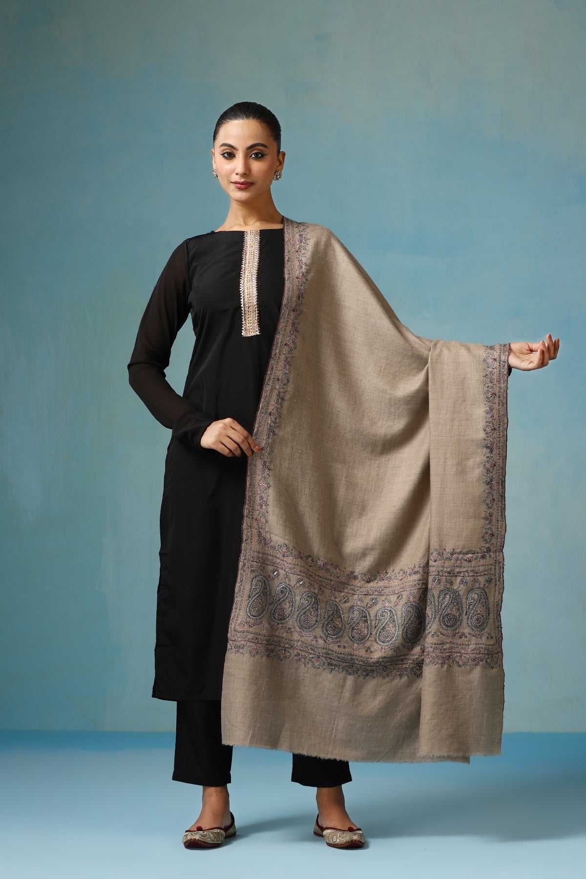 Embrace a unique blend of tradition with the Emilia Pashmina Shawl. Handcrafted from the finest pure pashmina wool, this shawl features captivating paper mache gulab work, delicate floral motifs crafted from hand-molded paper. Delicate zari handwork adds a touch of shimmering elegance. Incredibly soft, warm, and lightweight, it drapes beautifully, making a one-of-a-kind statement.