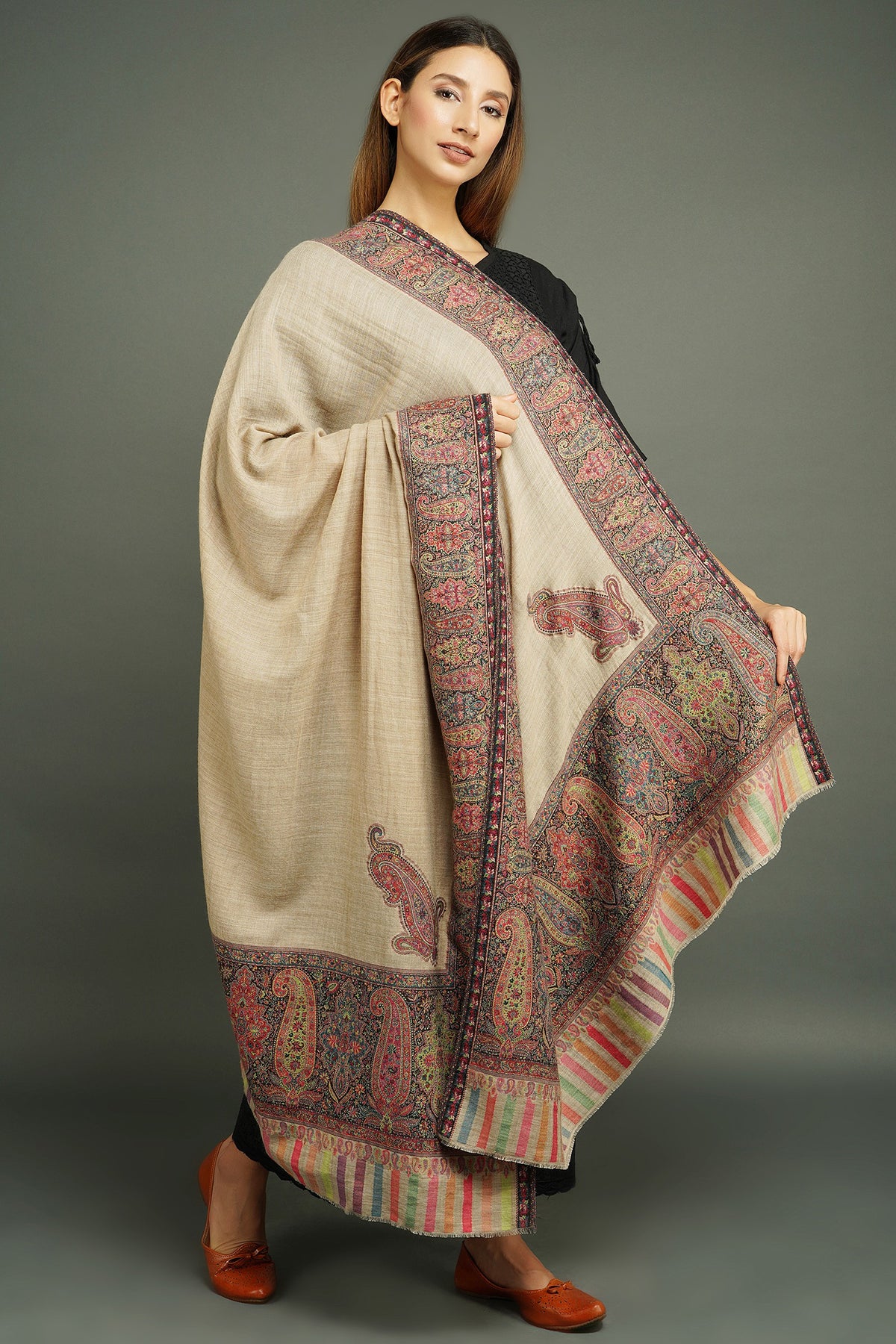 This Pashmina wool with Antique Jamawar border with Paisely detailling shawl, exclusively for your fine taste. This soft, warm, light-weight Shawl will level up your Stylistic game with ease. Pair it with any outfit and the shawl size 40x80.