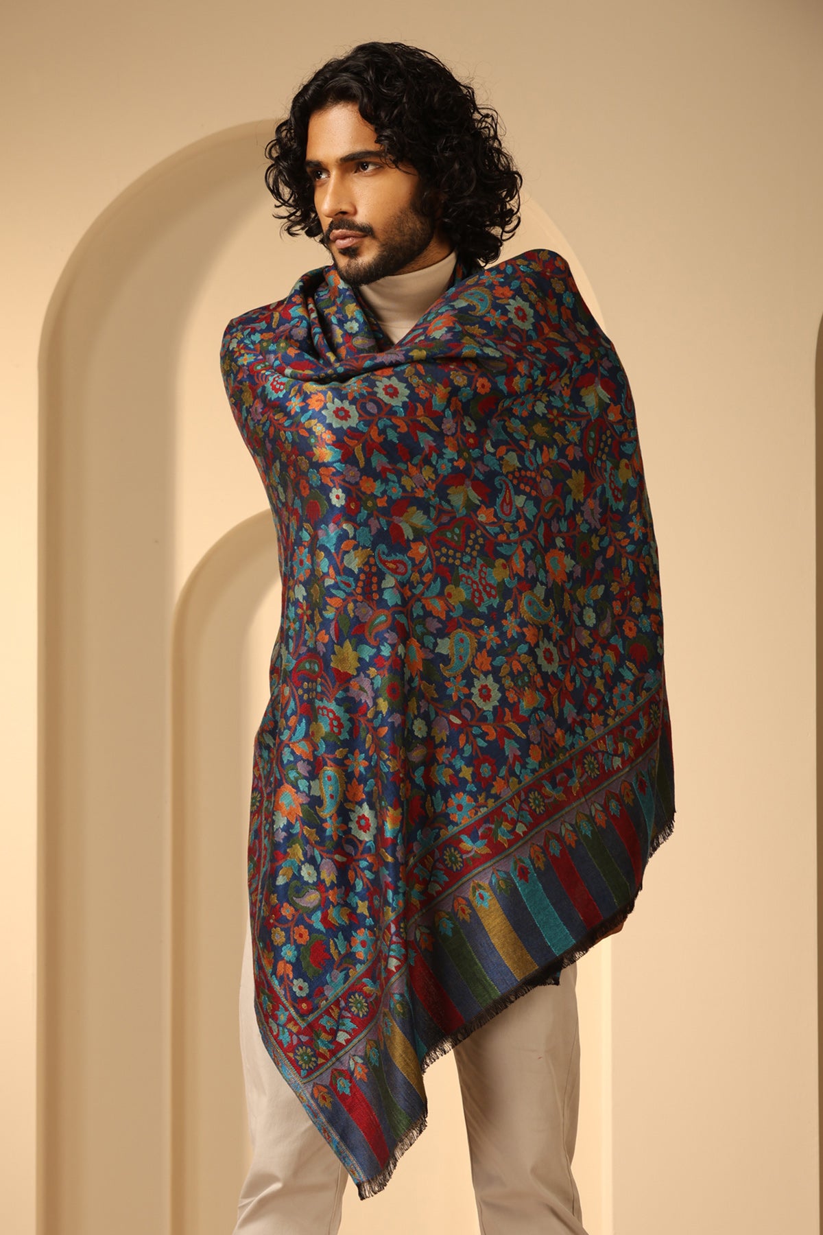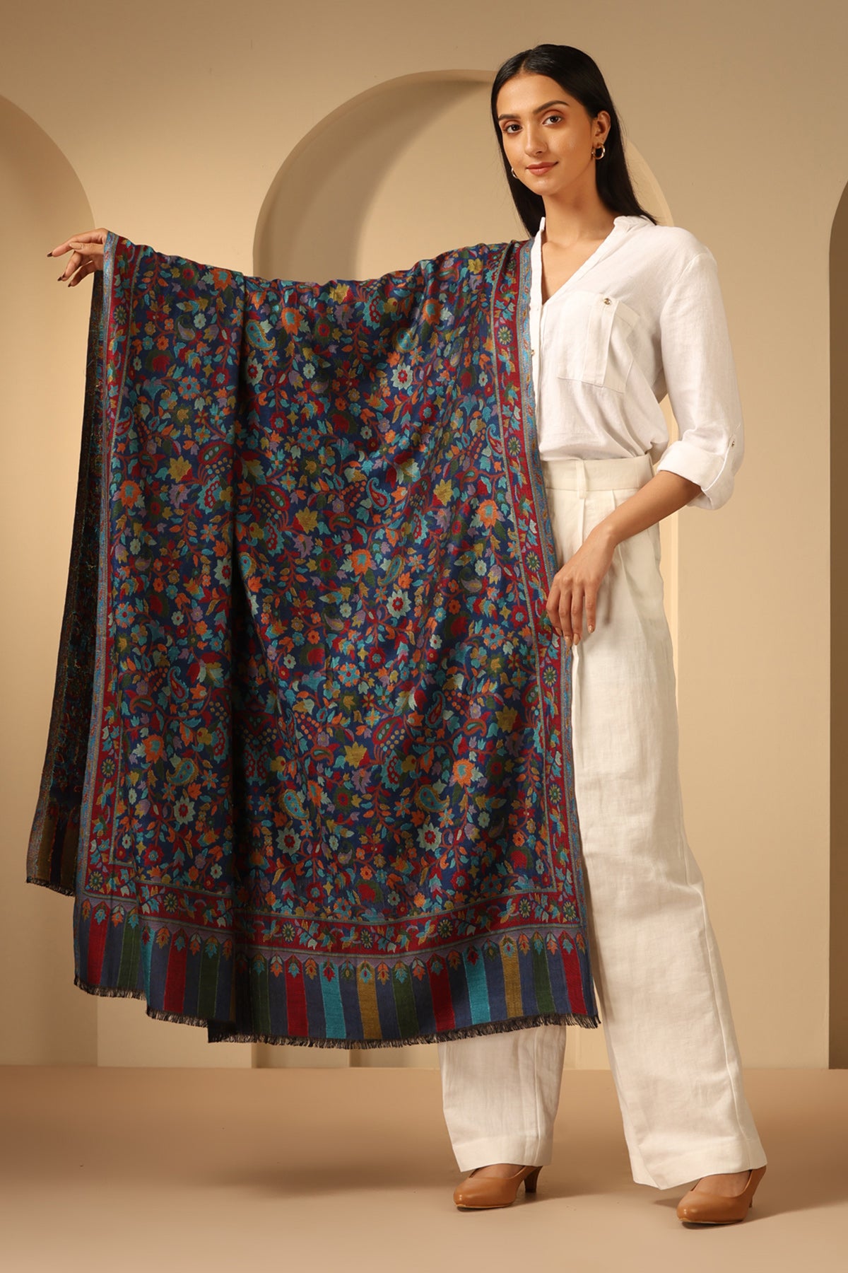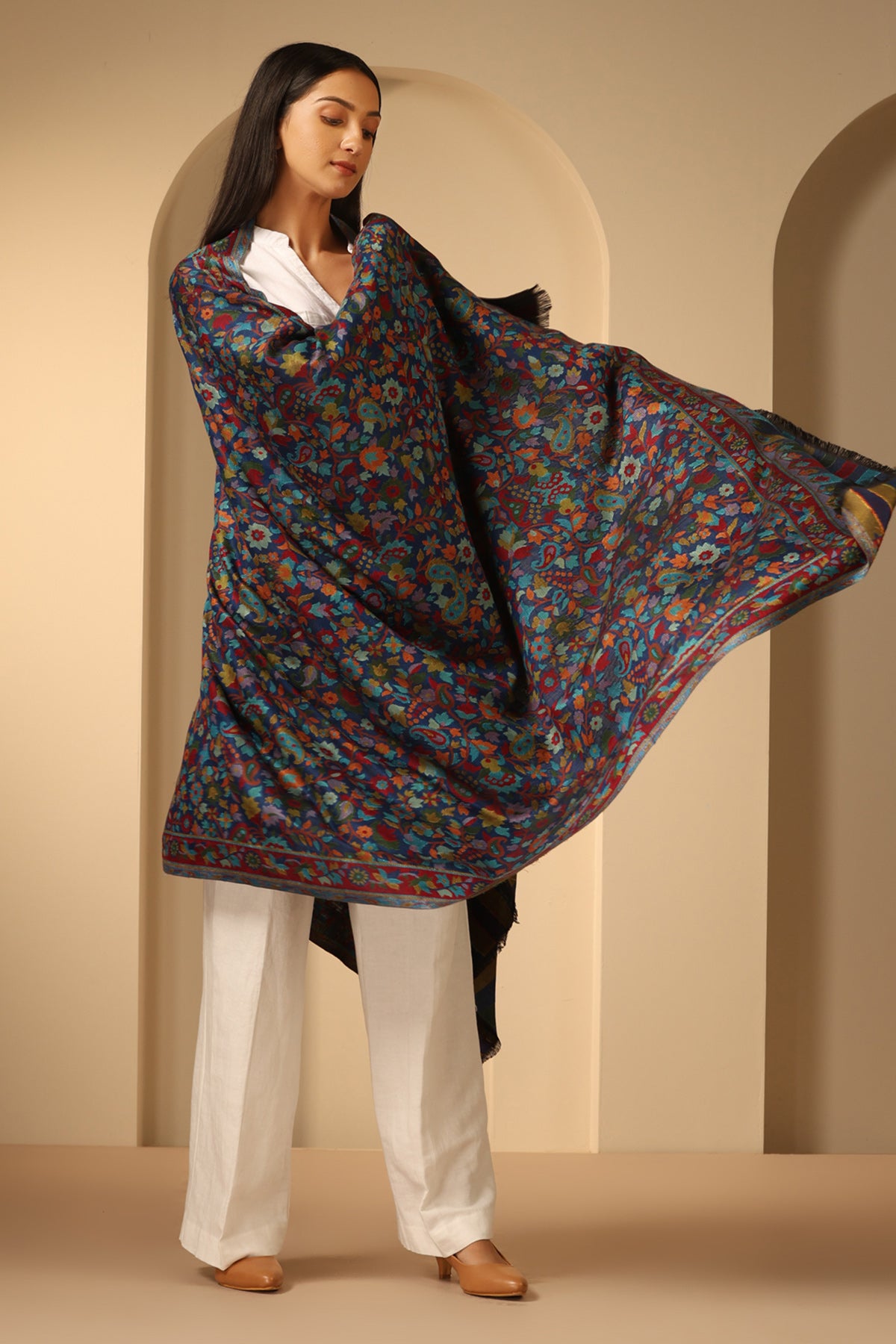 Introducing Radhi kani Design cashmere fine wool shawl in sleek black. Elevate your style with its exquisite craftsmanship. Stay cozy & chic.