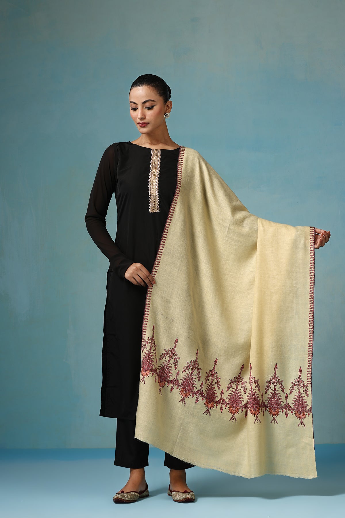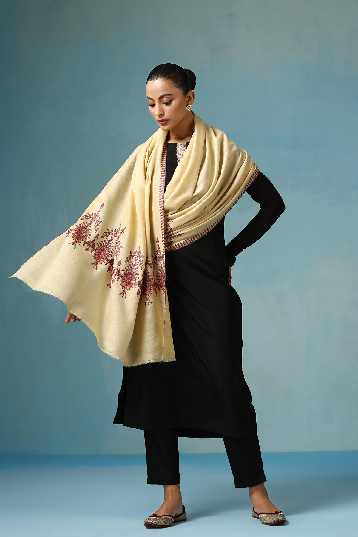 Experience unparalleled luxury with the Simone Pashmina, a GI-certified shawl showcasing the artistry of Sozni embroidery. Handcrafted from the finest pashmina wool, this shawl features intricate Sozni work, a traditional Kashmiri art form with a rich history. Incredibly soft, warm, and lightweight, it drapes beautifully, making a unique statement of cultural heritage and timeless elegance.