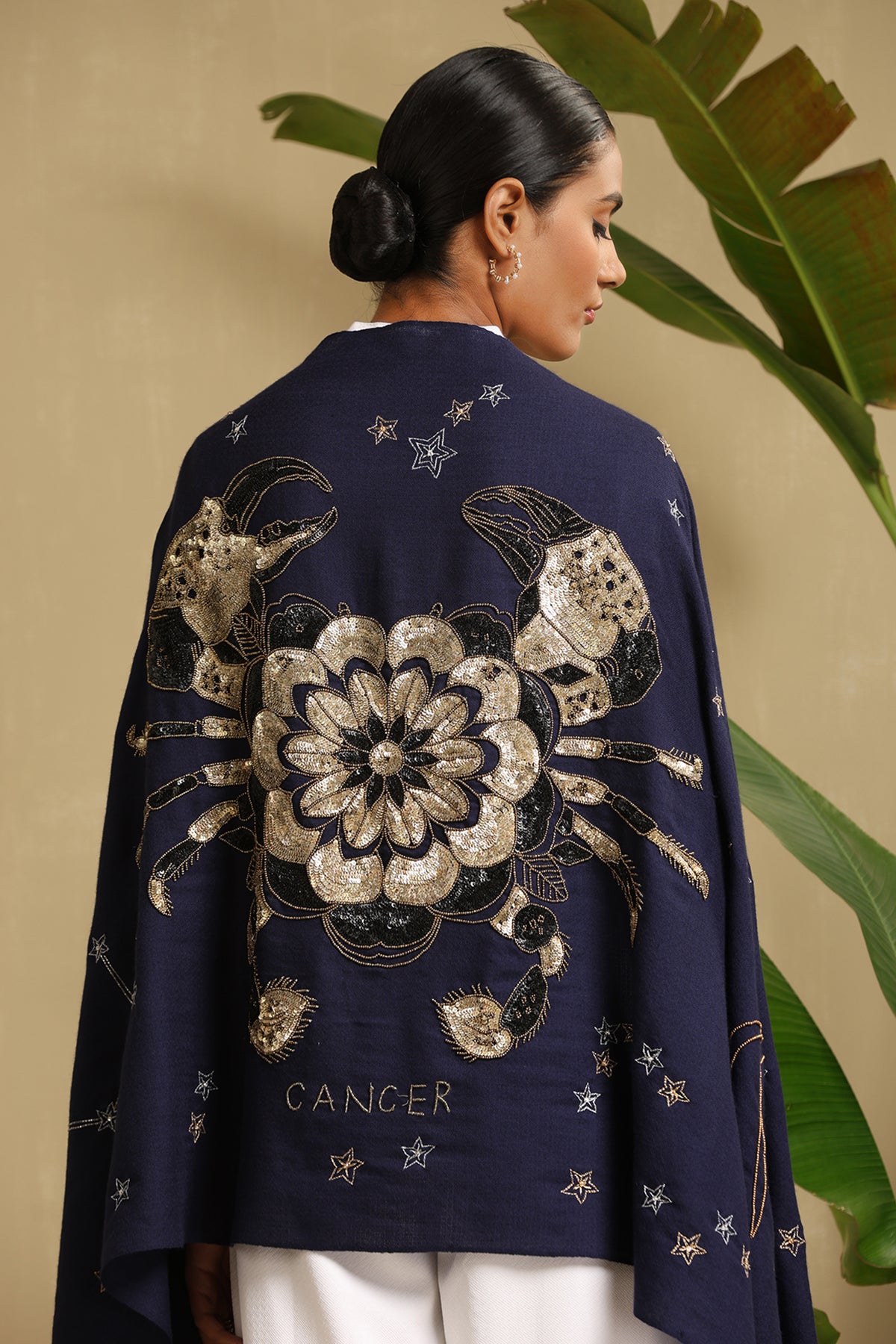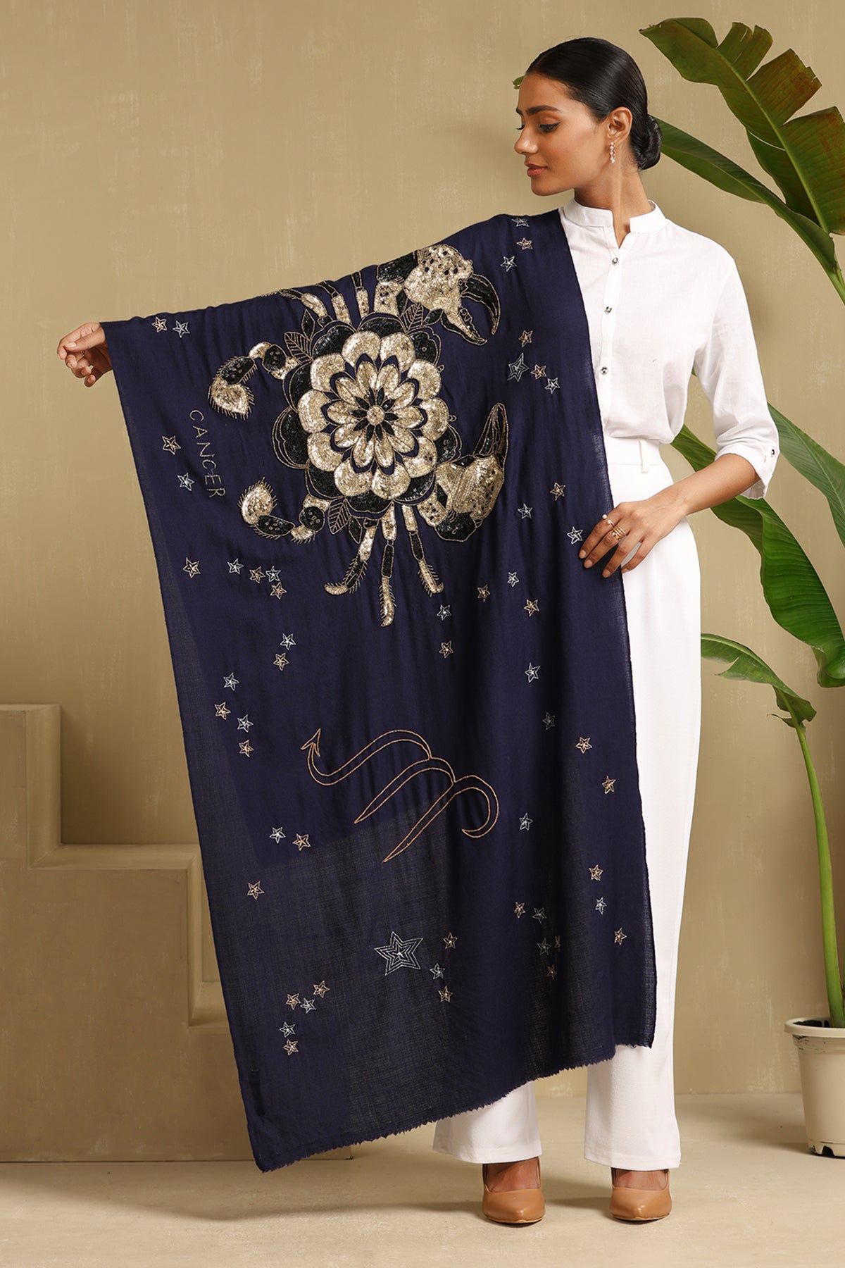 This stole makes a statement about your unique taste. Wear your favorite stole to cover your shoulders. This stole is suitable for any occasion. You may wear this everywhere, including holiday celebrations, festivals, and office parties. The blue-colored stole has a Cancer theme with stars and a crab. This stole has a design of sequence pipe work and thread work. The fabric is exceptionally soft against your skin and provides warmth and comfort in the cold. You will undoubtedly receive compliments when wearing this stole.