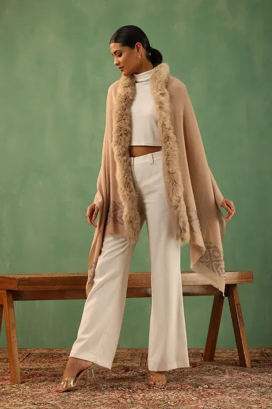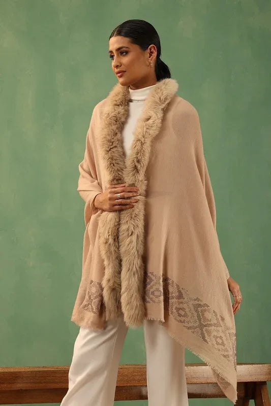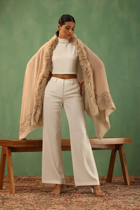 Crafted from beige Cashmere Fine Wool, the Margha fur stole features one-sided fur and stone work. It provides elegant warmth with a sophisticated touch.
