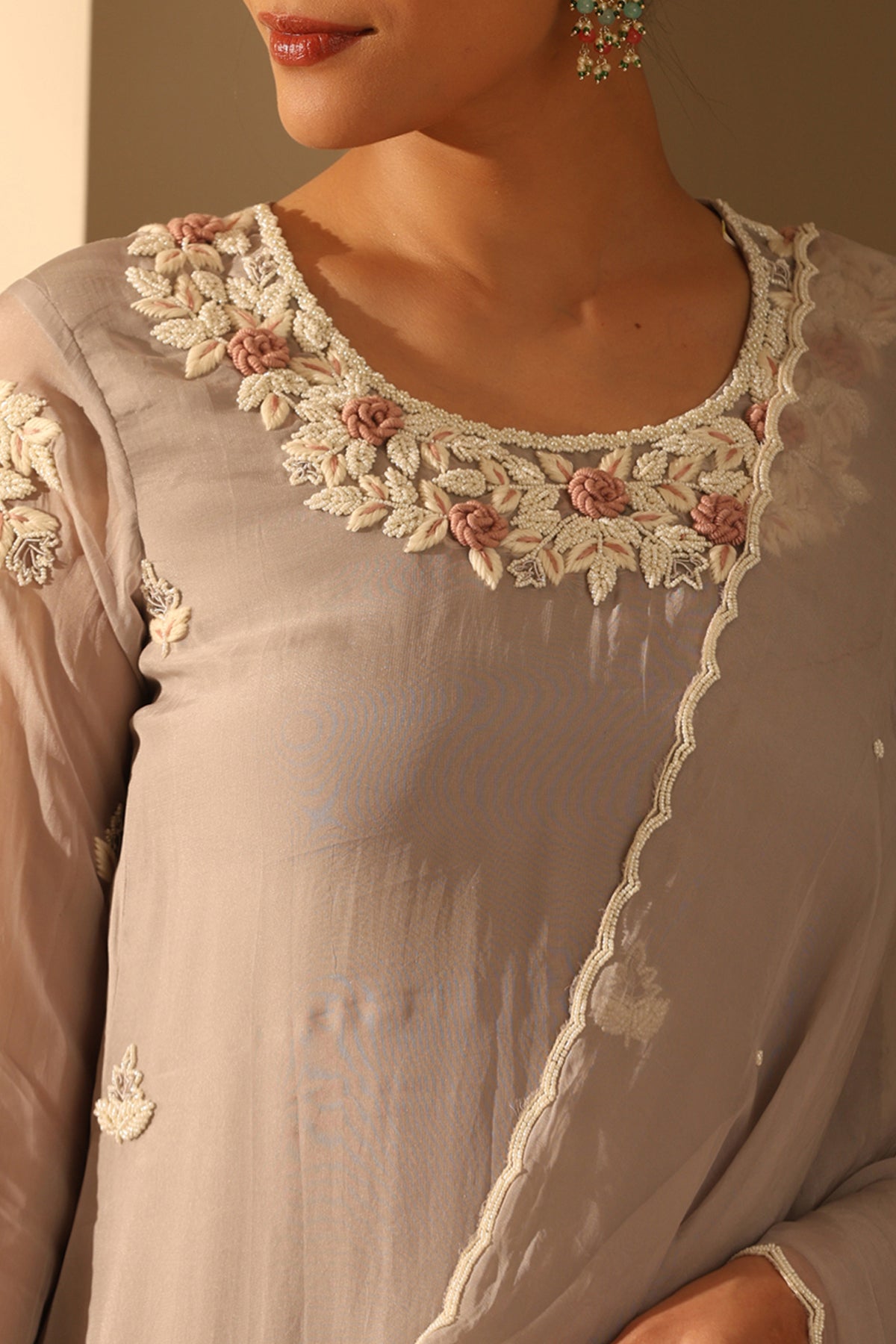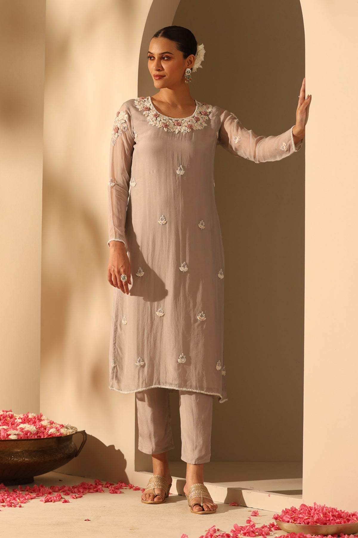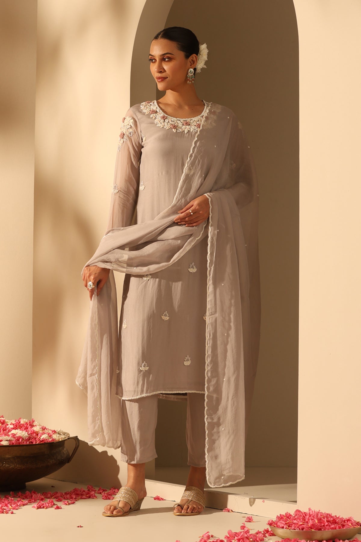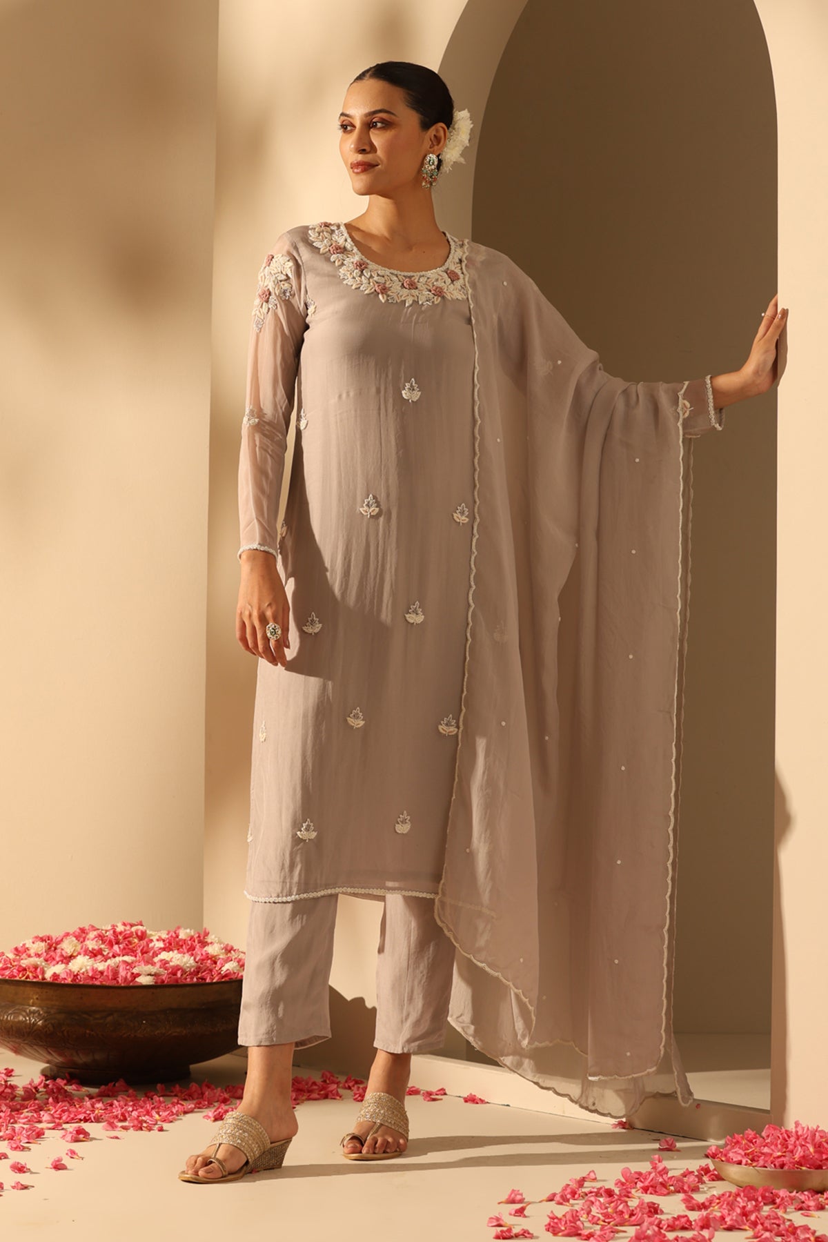 Elevate your style with the grey georgette suit set, intricately embellished with fine white beads along with exquisite handwork. Aanvi is a must-have attire for a timeless and elegant look.