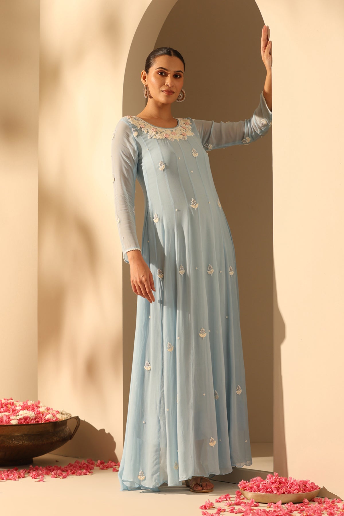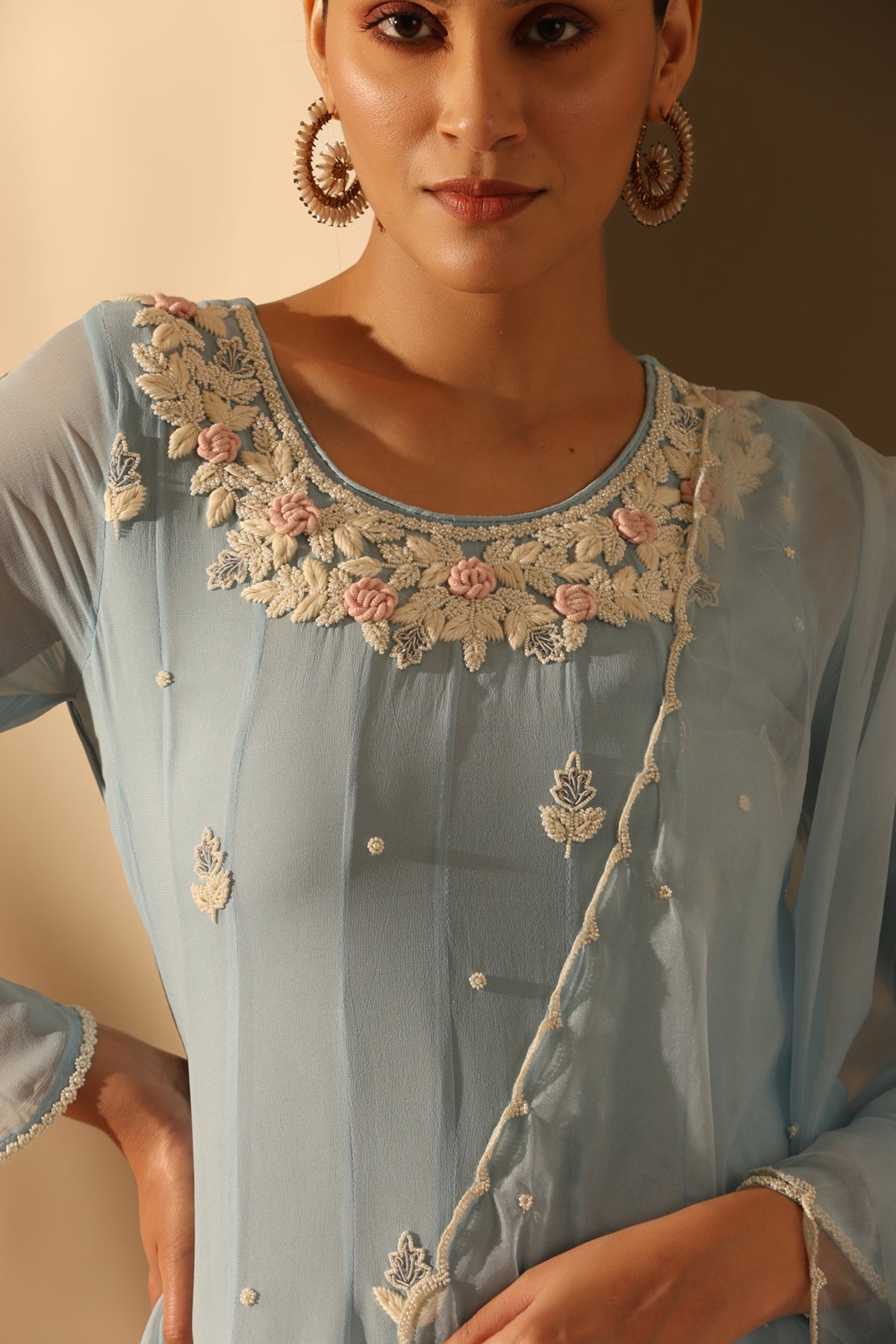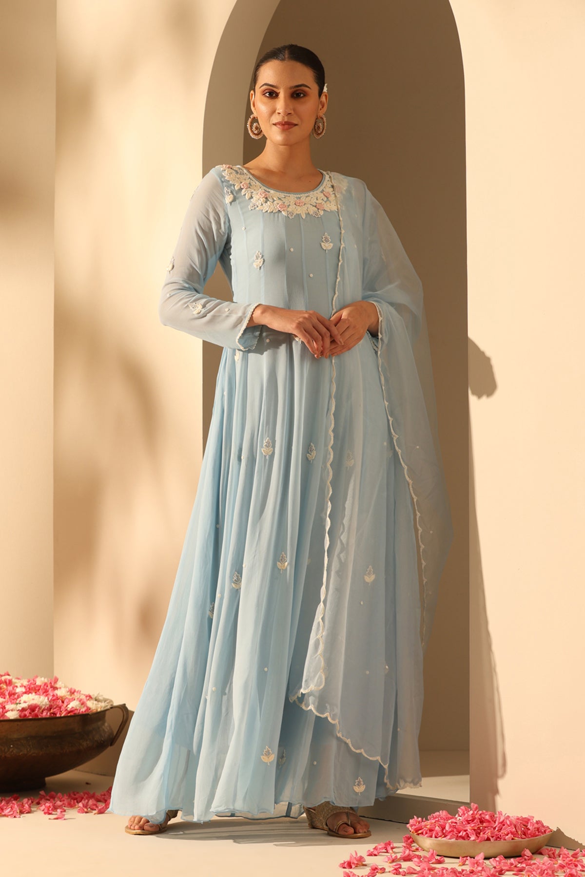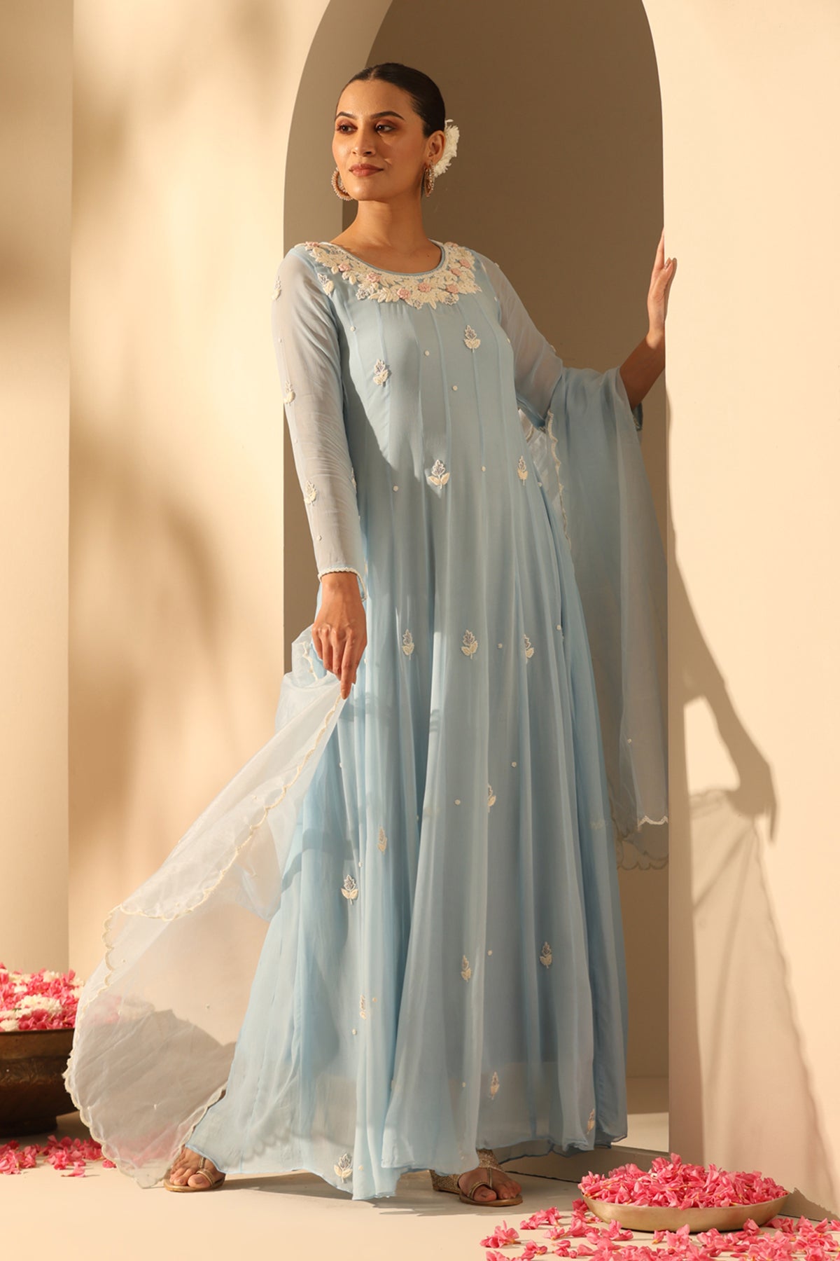 Aashi, a graceful pastel blue georgette suit set adorned with floral beadwork on the neckline and butta spread all over. Pairing it with the dupatta makes it the perfect must-have for you!