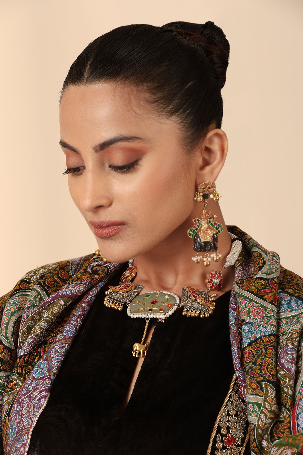 Indulge in vibrant luxury with the Andri Pashmina Shawl. Handwoven pashmina wool meets exquisite Kalamkari Adda work, creating a stunning shawl draped in silk stories. Soft, warm, and lightweight.