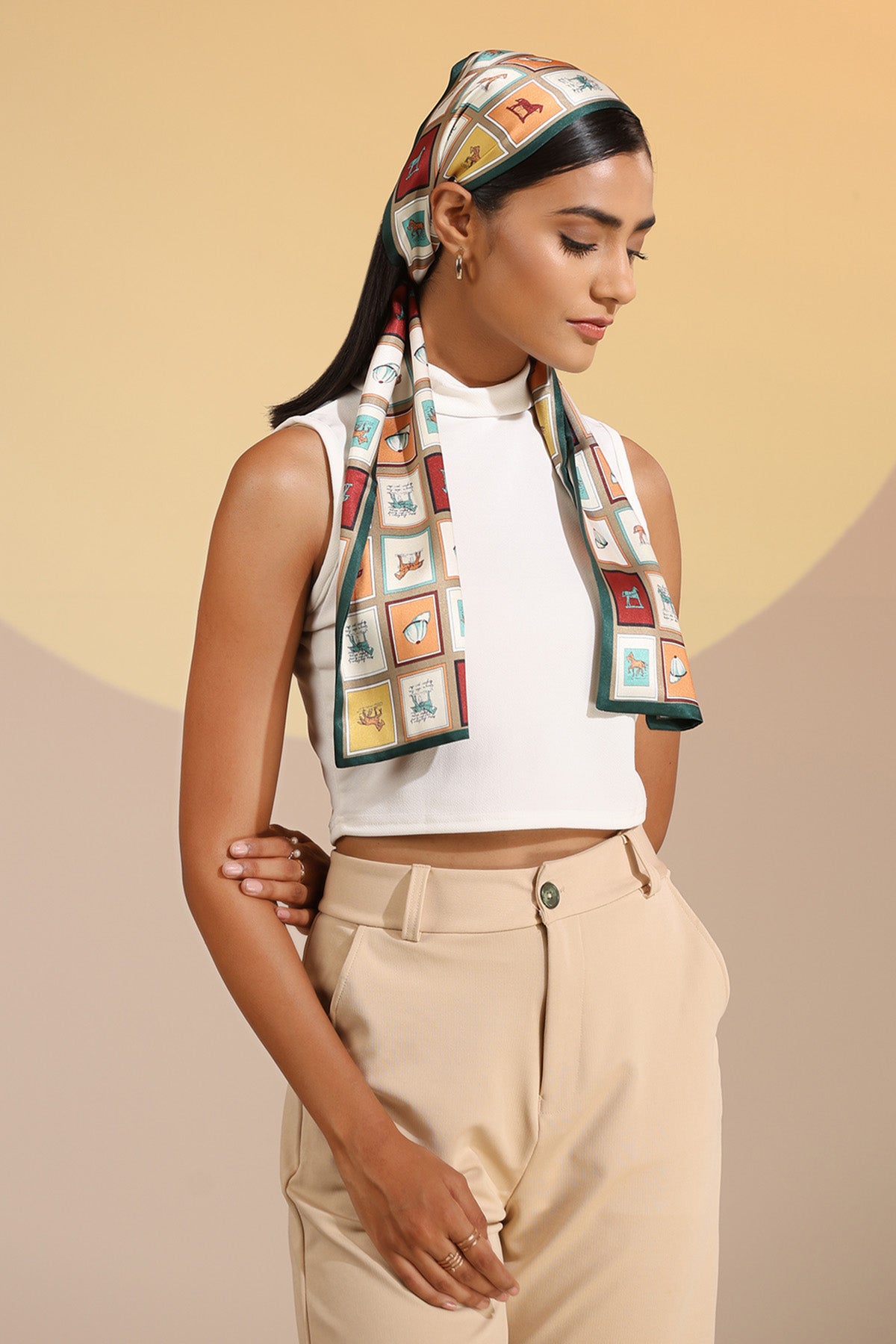 Gallop into style with the Auburn Silk scarf. This luxurious double-layered mulberry silk scarf features a charming horse print in a spectrum of colors. Perfect for accenting necklines or wearing as a headscarf, it adds a touch of equestrian flair and playful elegance to any outfit.