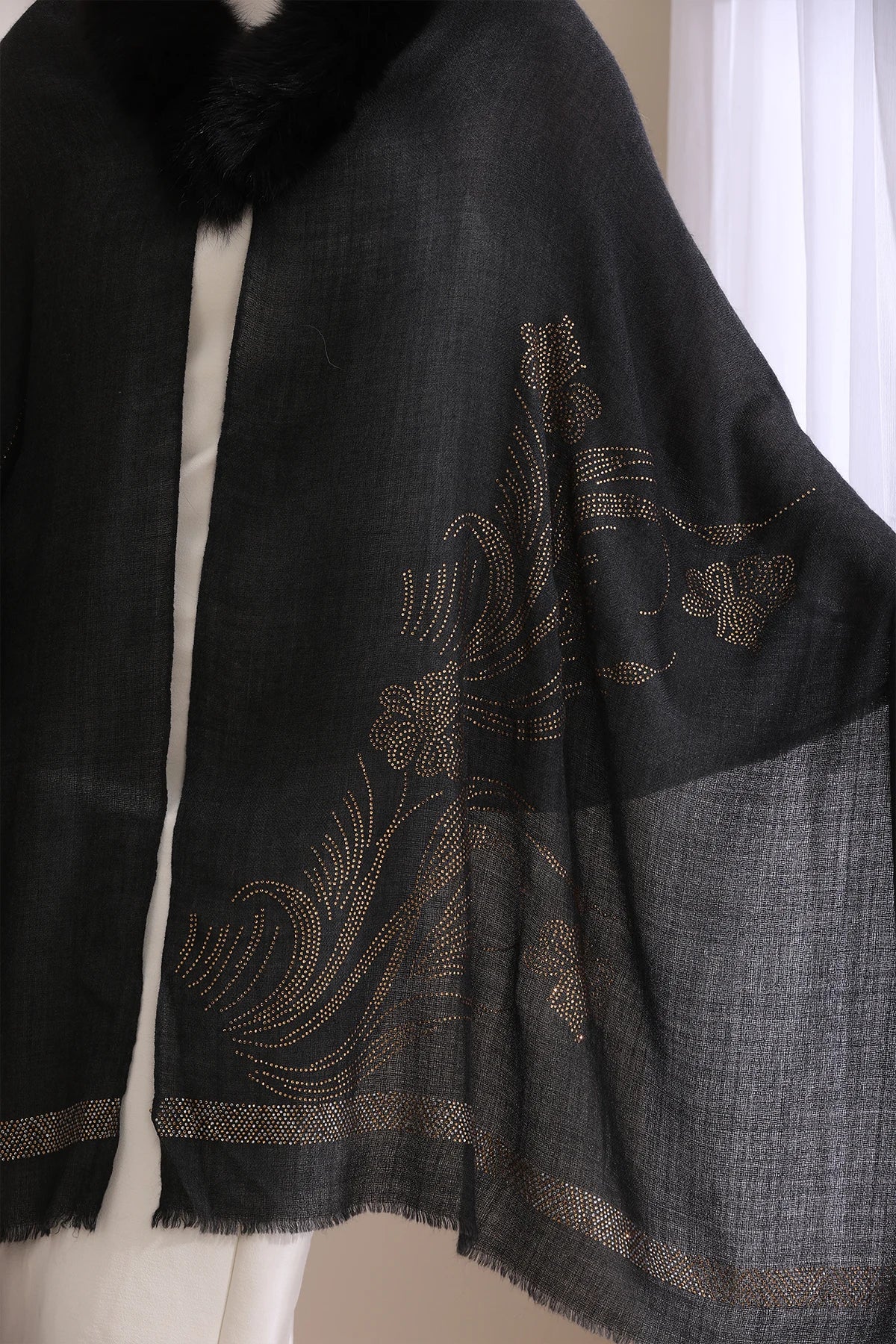 levate your style with this luxurious black stole, featuring an elegant fur collar and intricate metallic embroidery inspired by timeless floral motifs. Crafted from premium fabric for a soft, lightweight feel, this versatile stole wraps you in sophistication and warmth, making it perfect for both casual outings and special occasions. Pair it with your favorite outfits to add a refined touch to every look
