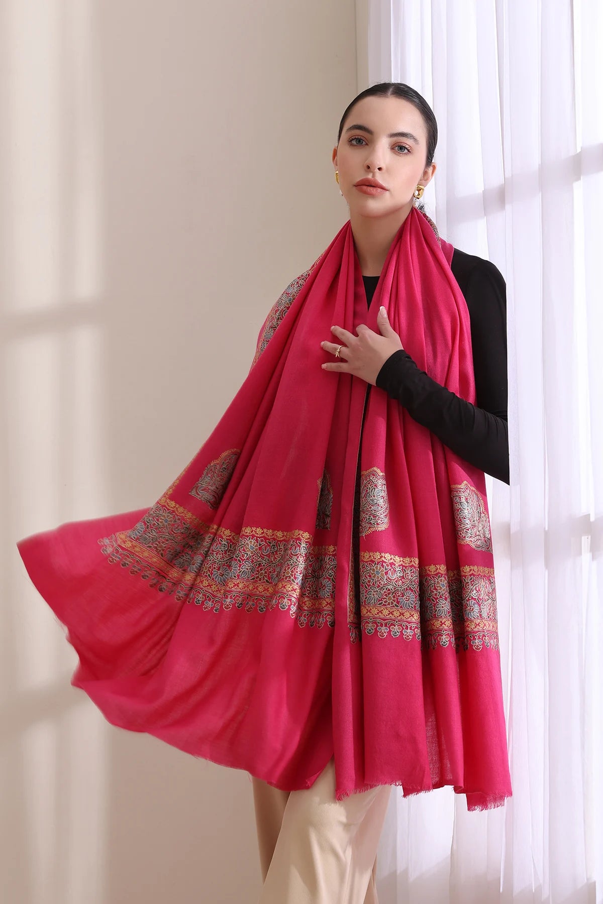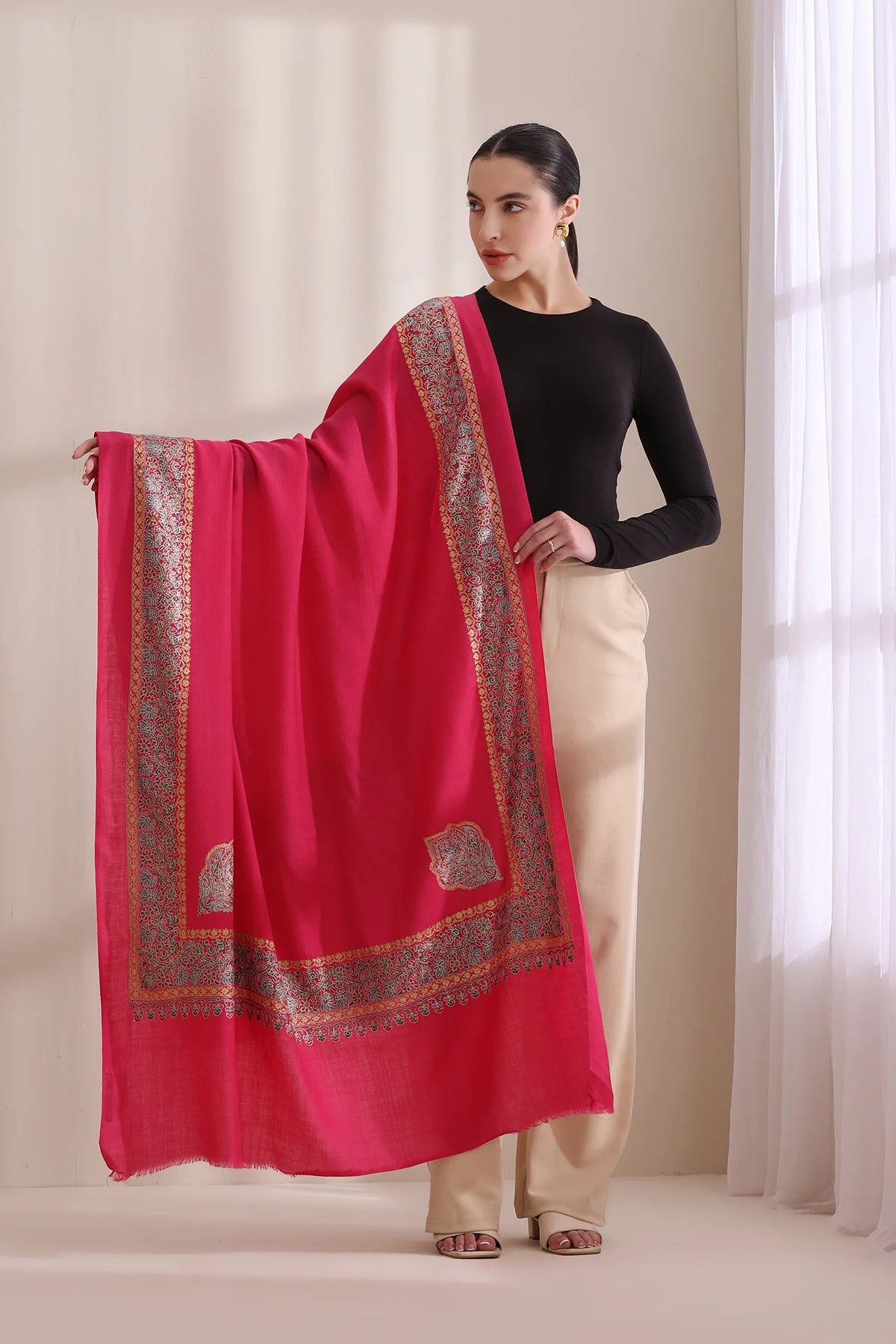 is luxurious magenta stole blends tradition and elegance with intricate Kashmiri-inspired embroidery in gold and silver threads, featuring delicate floral and paisley motifs along the border and palla. The rich craftsmanship is highlighted by fine detailing, giving the stole a regal finish perfect for both festive and formal occasions. Its vibrant color and ornate design add a timeless appeal, making it a unique wardrobe statement and perfect for gifting your loved ones.