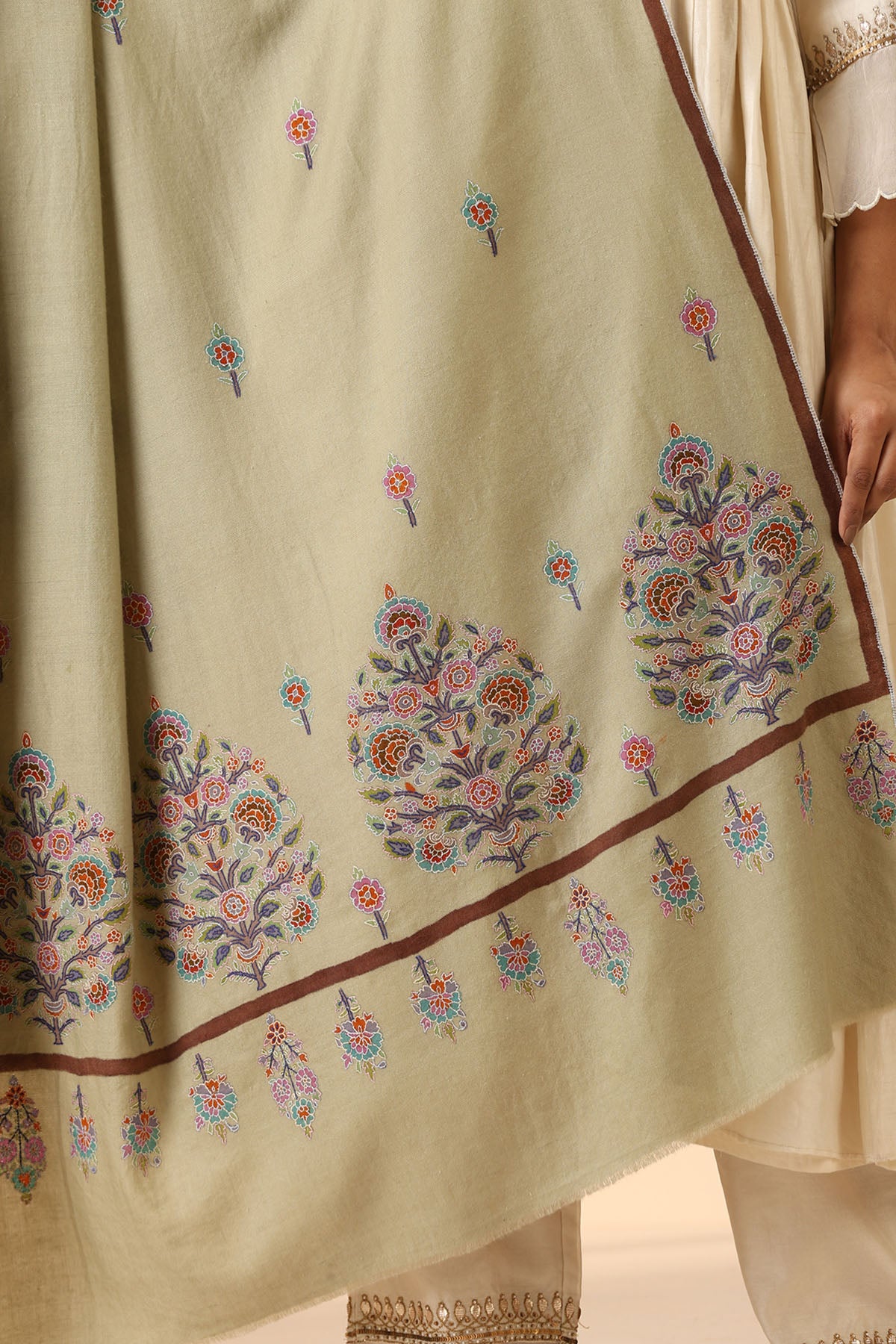 Handwoven from the finest pashmina wool, this shawl is a true masterpiece. It features intricate Kalamkari Phul Kaar embroidery, a traditional art form from Andhra Pradesh, India. The vibrant floral motifs and paisleys are meticulously hand-painted using natural dyes, creating a truly unique and captivating design.