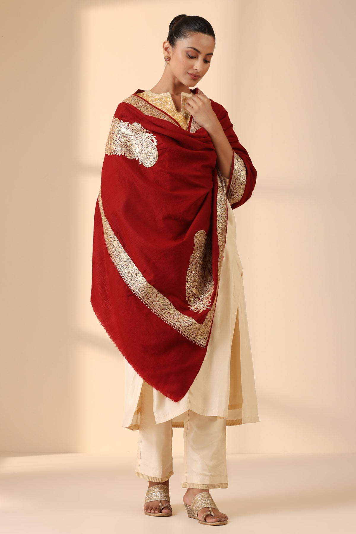 Experience opulence redefined with the Naomi Pashmina Shawl. Handwoven from pure pashmina wool, this shawl boasts intricate zari handwork, creating a stunning display of shimmering elegance. Incredibly soft, warm, and lightweight, it drapes beautifully, elevating any ensemble to regal sophistication.