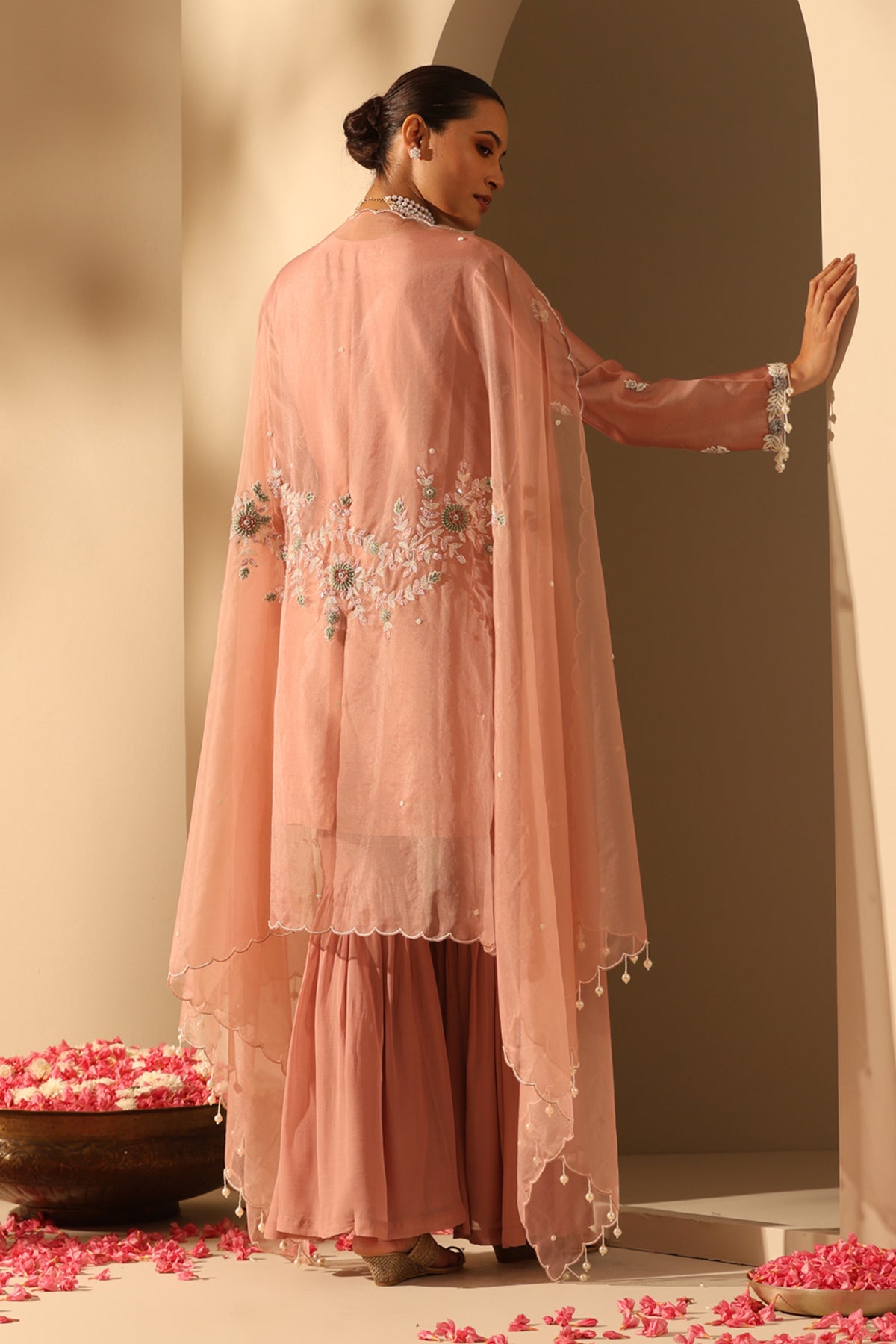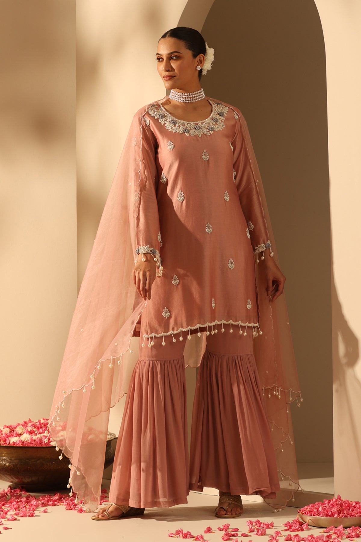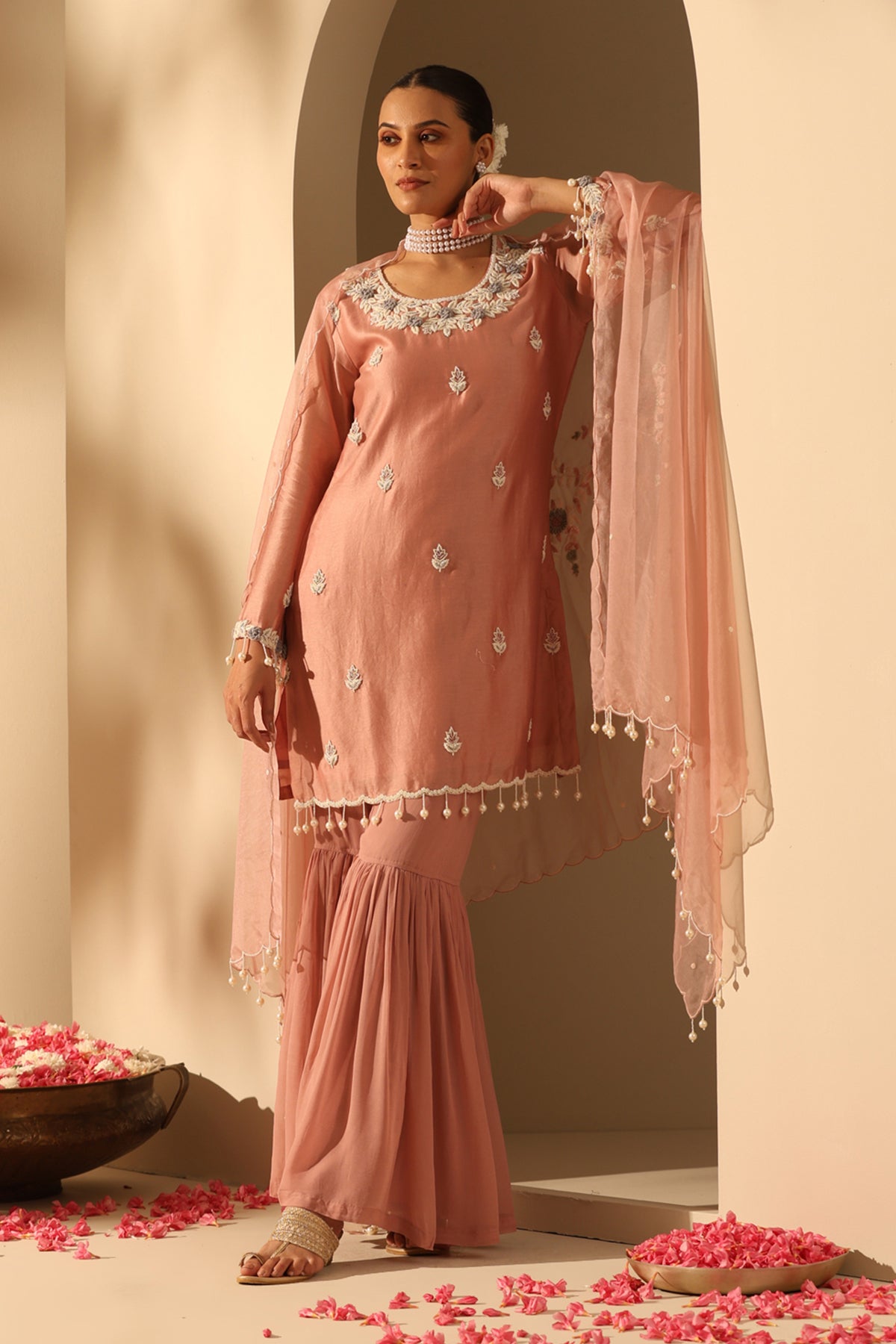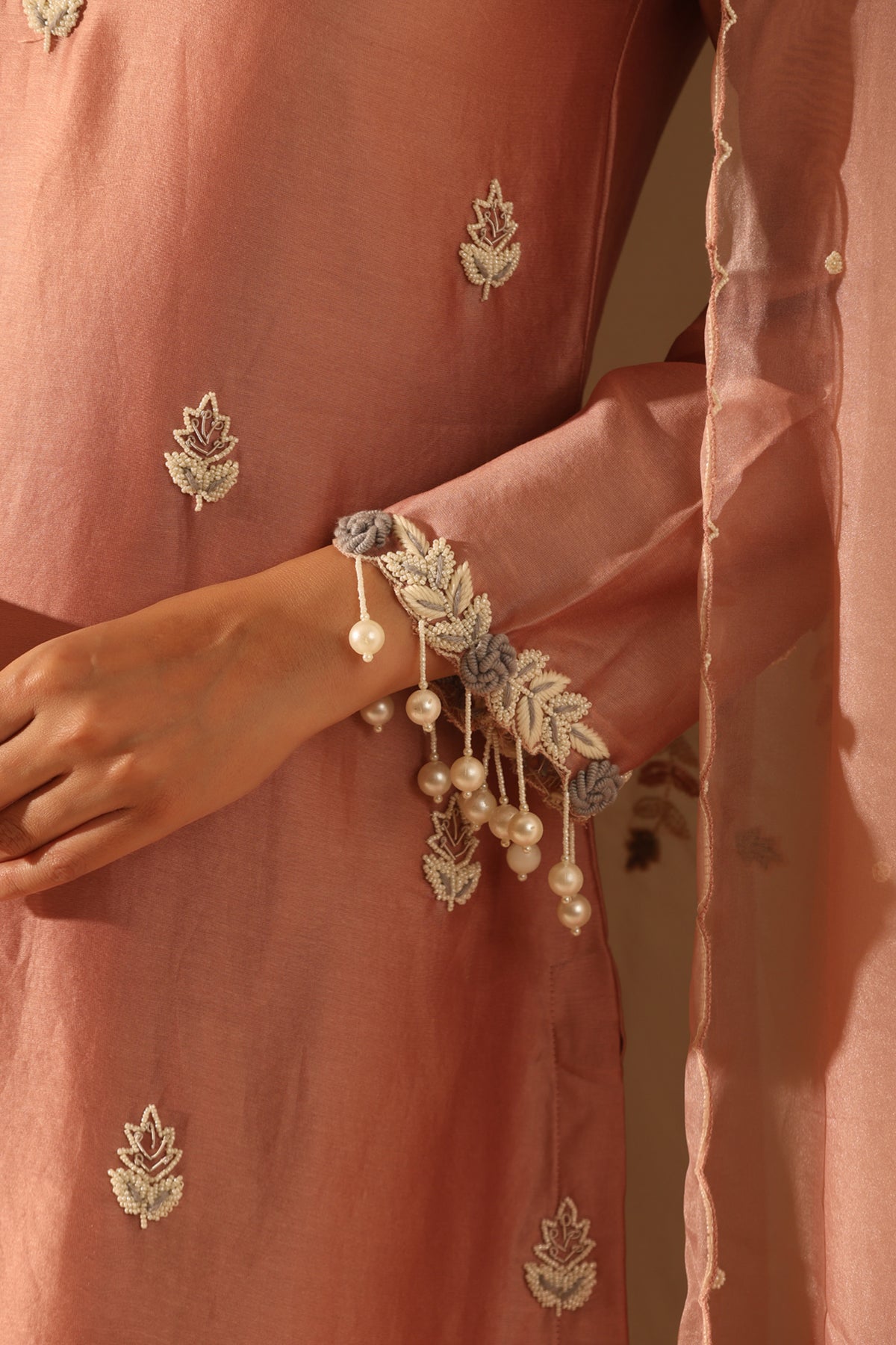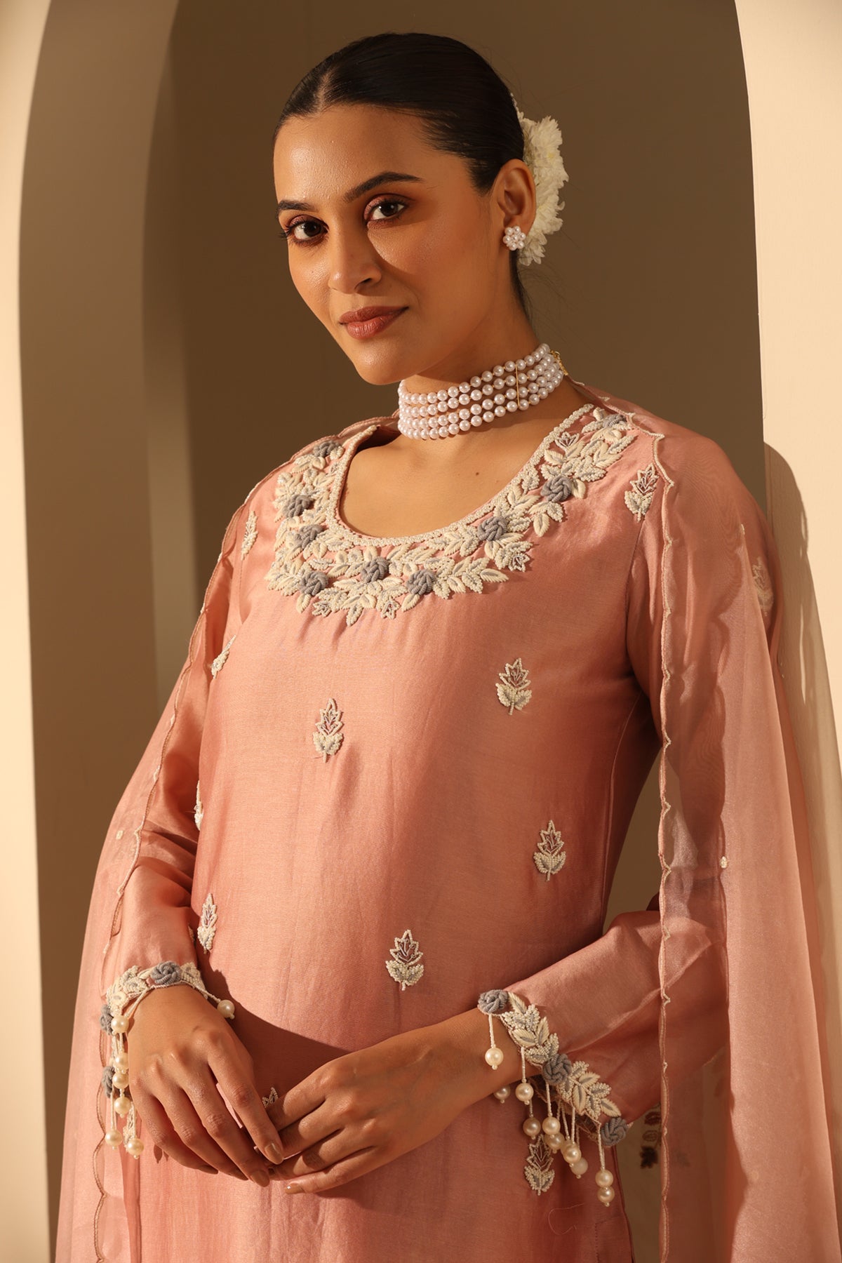 Neela, the pearl pink chanderi suit set brings along a fashion trend that is unique. Adorned with pearl dangles along the sleeve border and the daaman, this suit set becomes a rich wear.