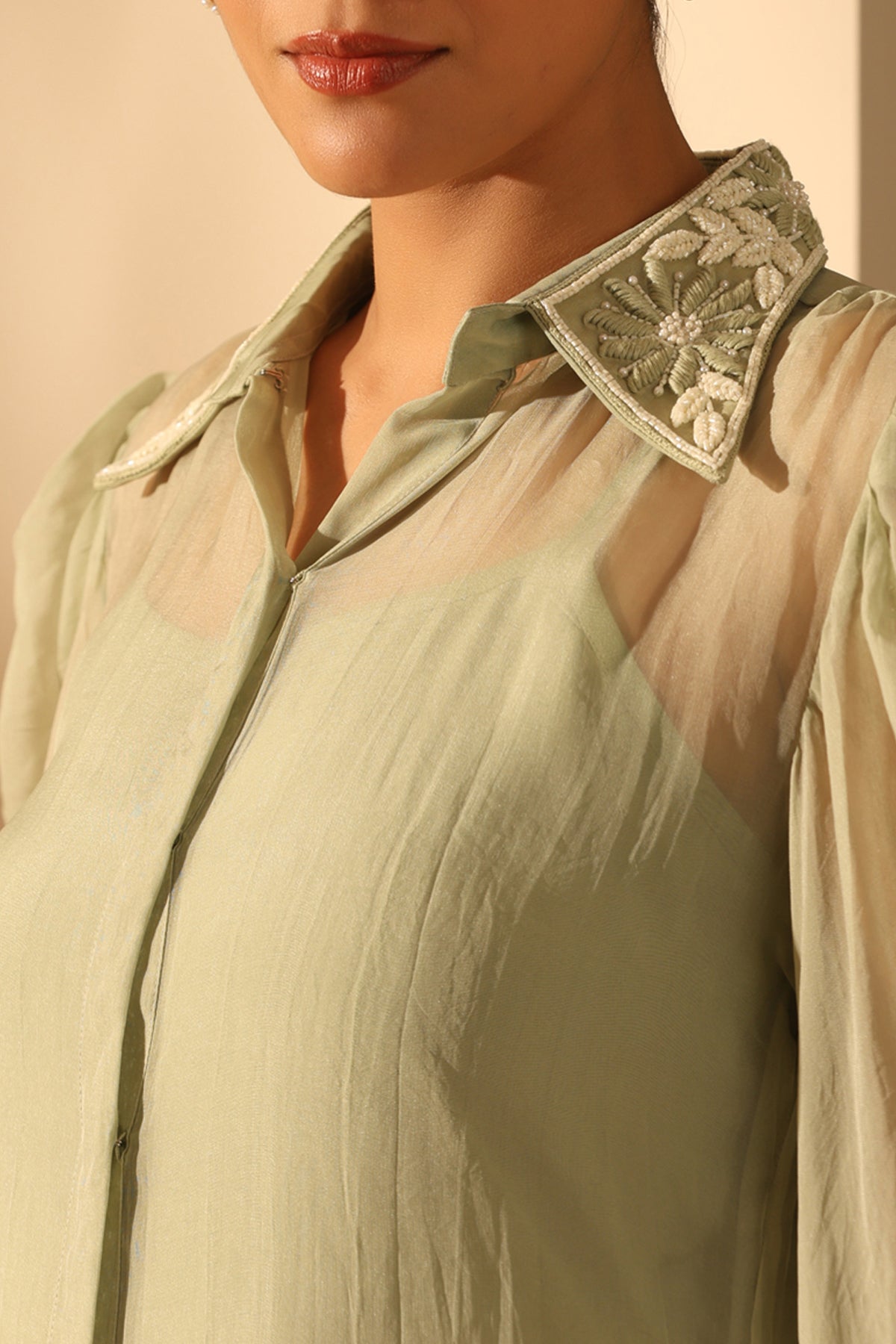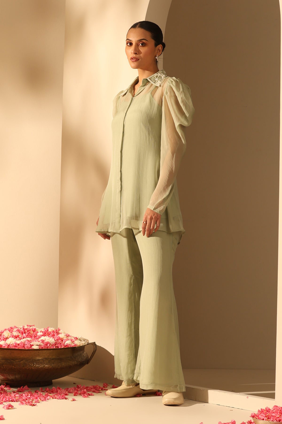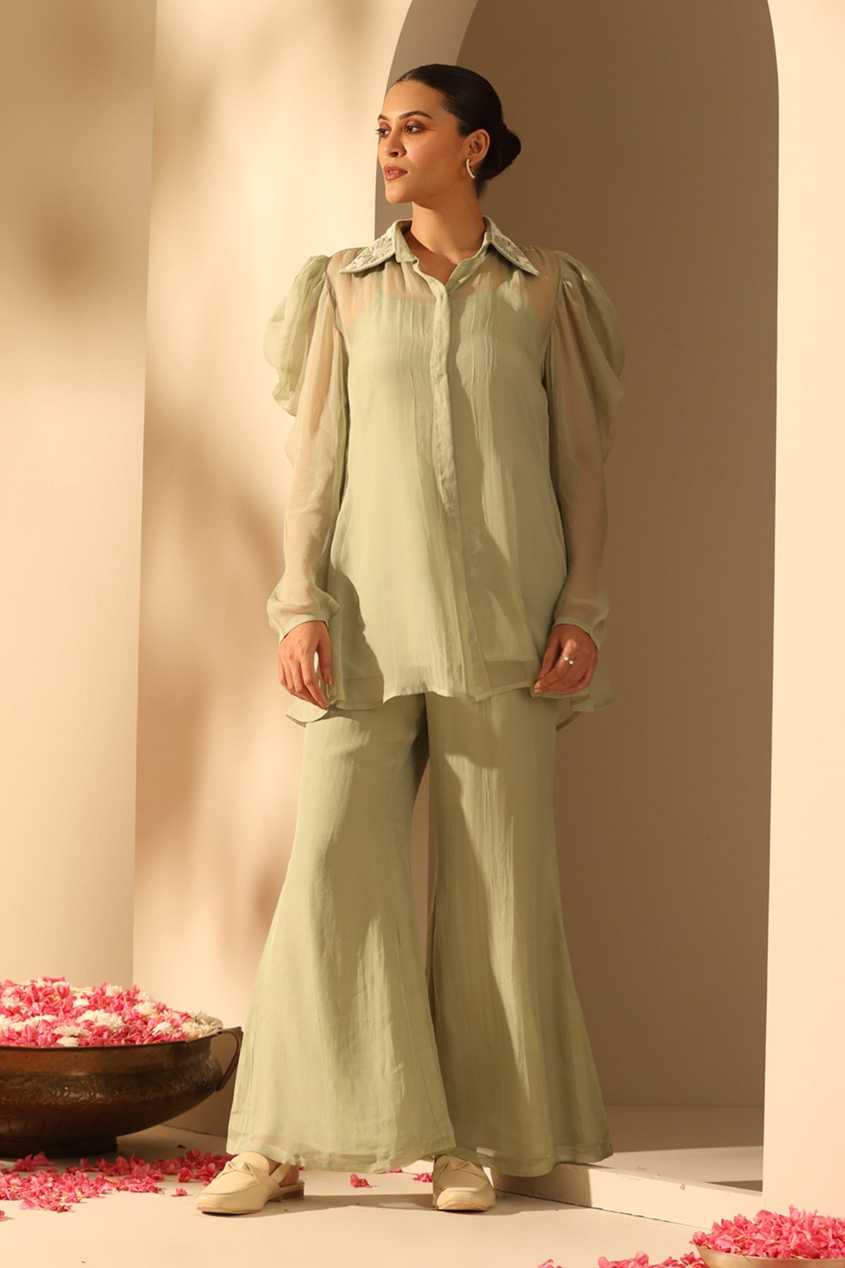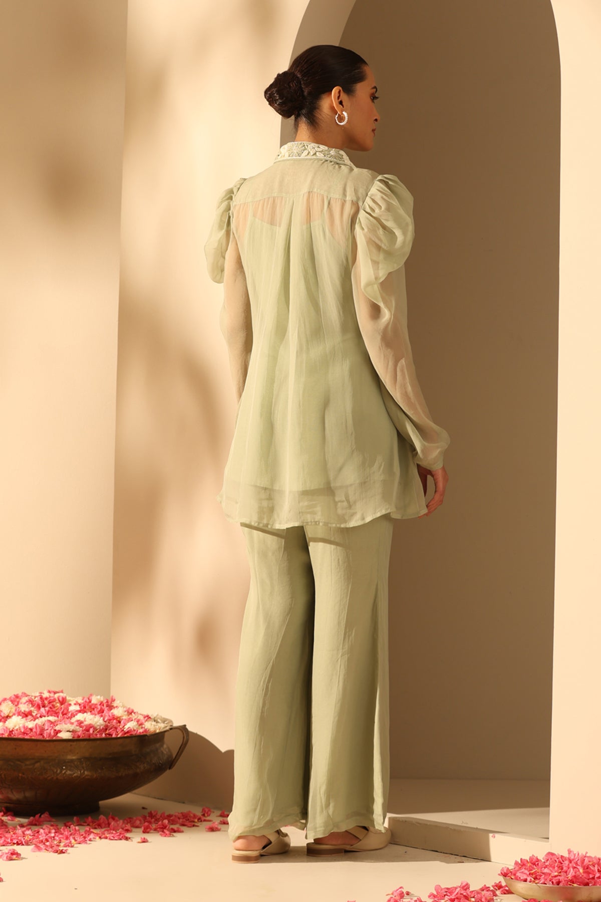 Enhanced with styled floral bead and thread work collar and sleeve border, the Raghvi kurta bottom co-ord set is a must have party wear.