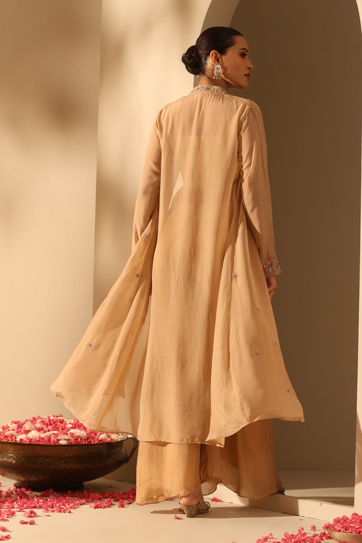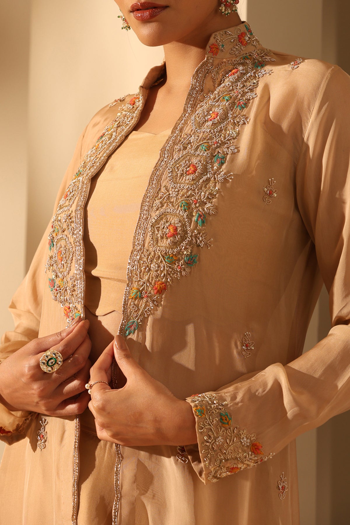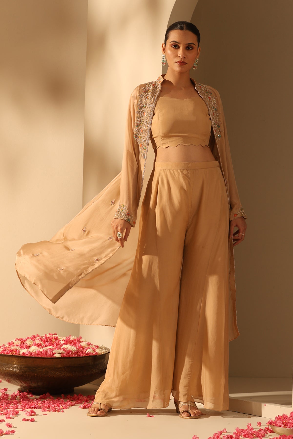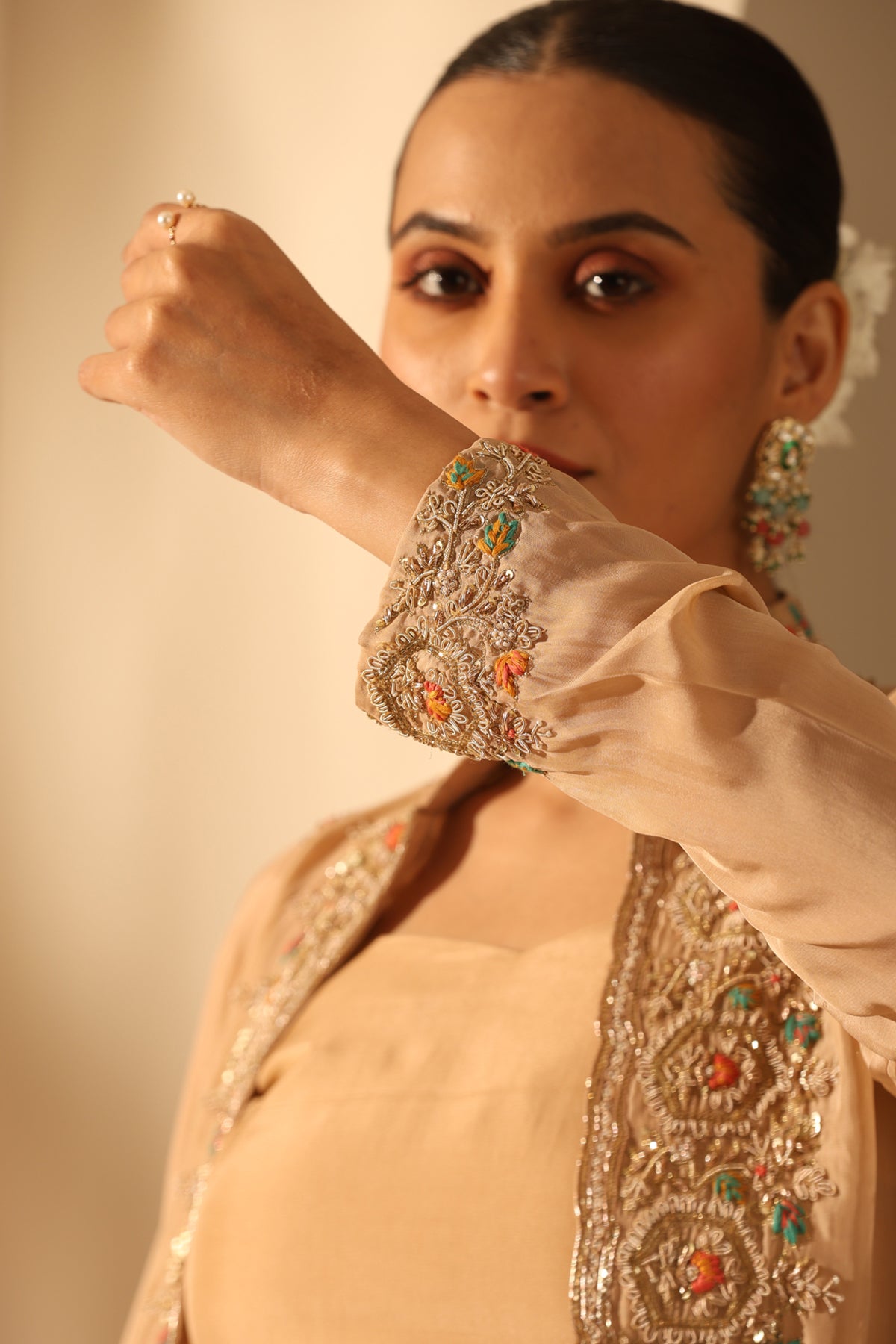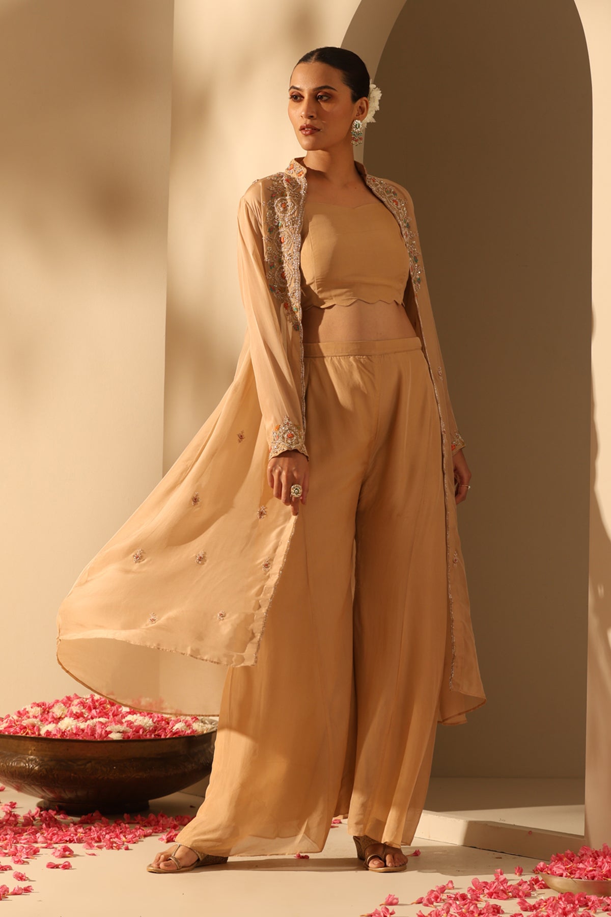 Rhimjhim, a soft organza beige bralet cape set adorned with green, golden and orange hand work brings along the rain of fashion. It comes with a matching cape and set of pants.