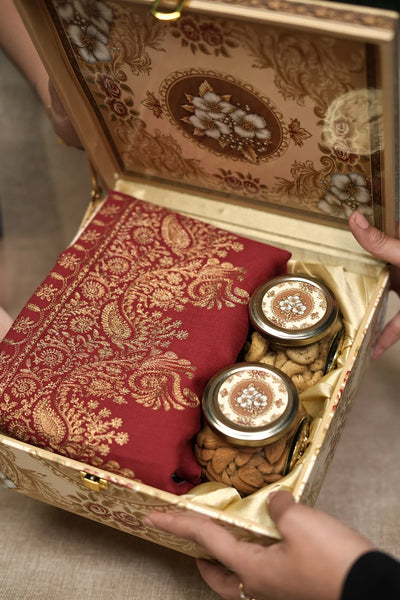 Red & Gold Pashmina stole with Aari & Zari Embroidery – Luxury Diwali, Wedding & Festive Gift Box Hamper