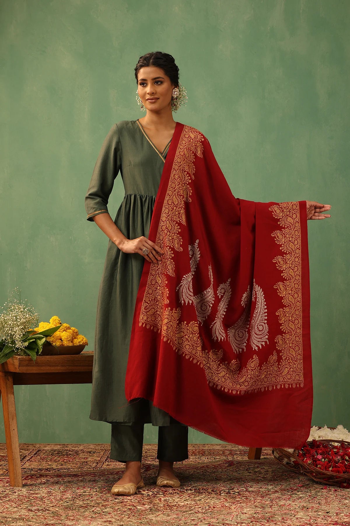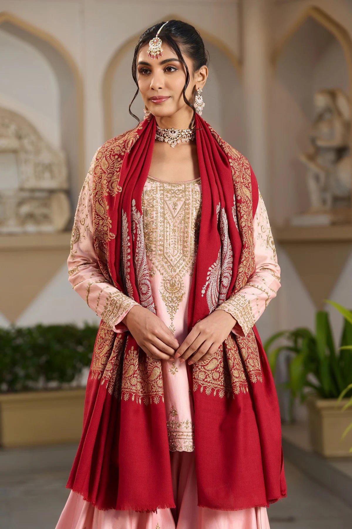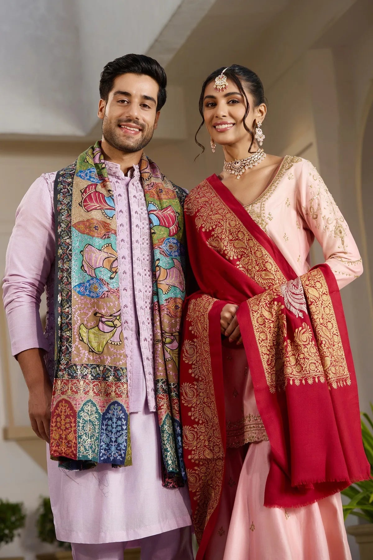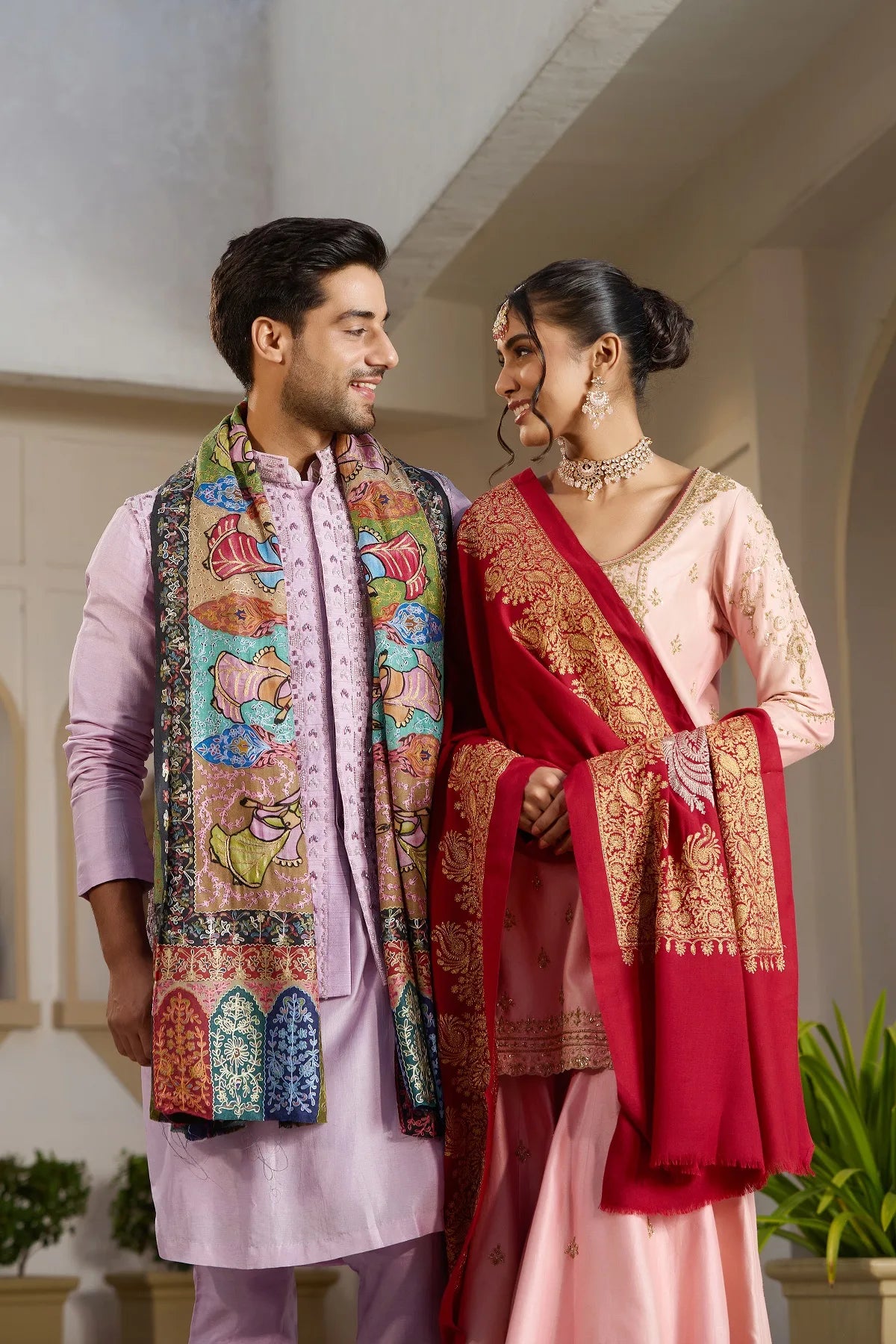 Experience the luxury of the Tiari stole, meticulously crafted from Cashmere Fine Wool. Showcasing intricate Aari work and a stunning paisley design, this exquisite piece reflects artistry.
