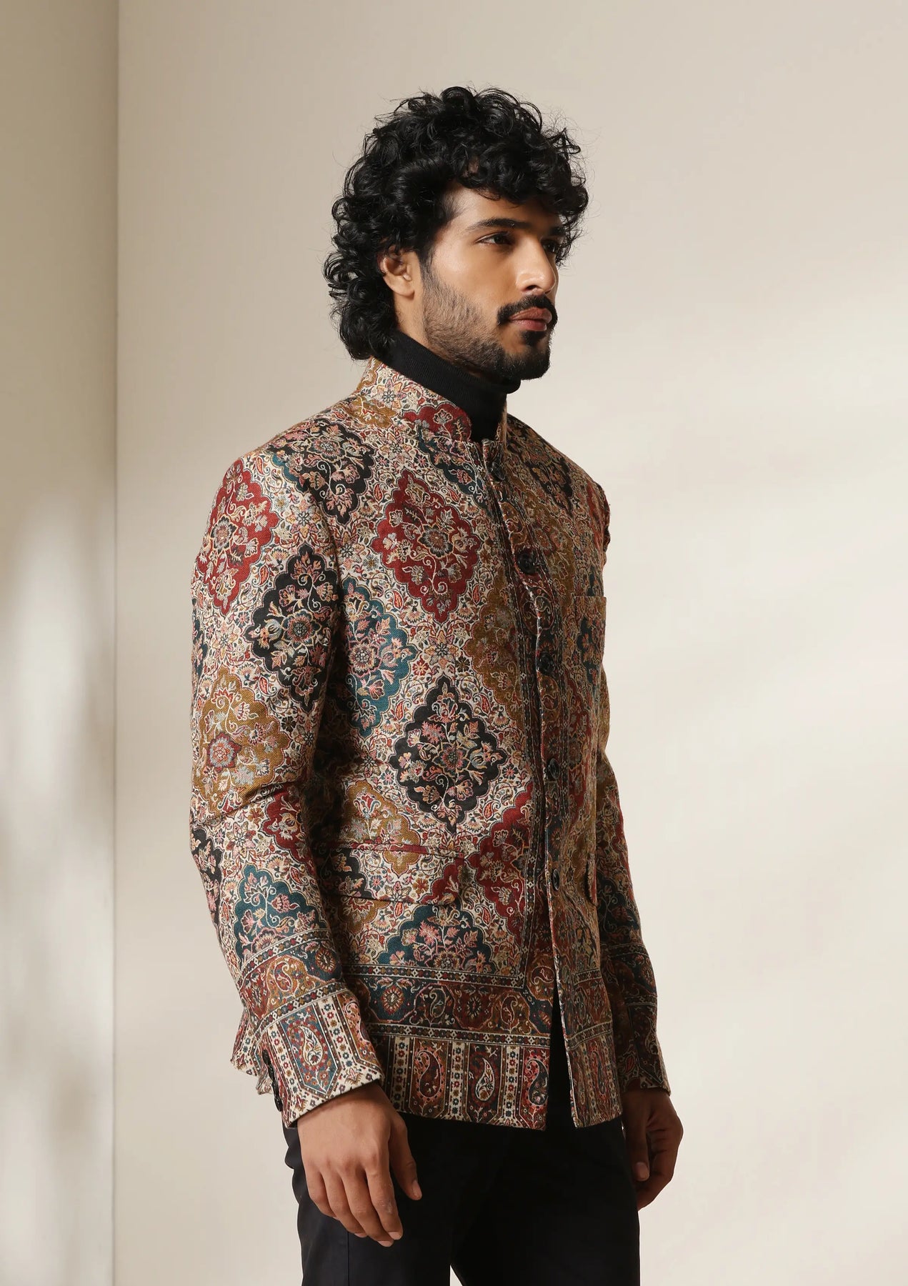 The Heritage Mosaic Wool Coat by Dusala India embodies the perfect fusion of royal Indian design and modern tailoring. A best-selling men’s blazer and coat hybrid, this piece features a sophisticated high-collar silhouette and intricate Kashmiri-inspired motifs in rich jewel tones.