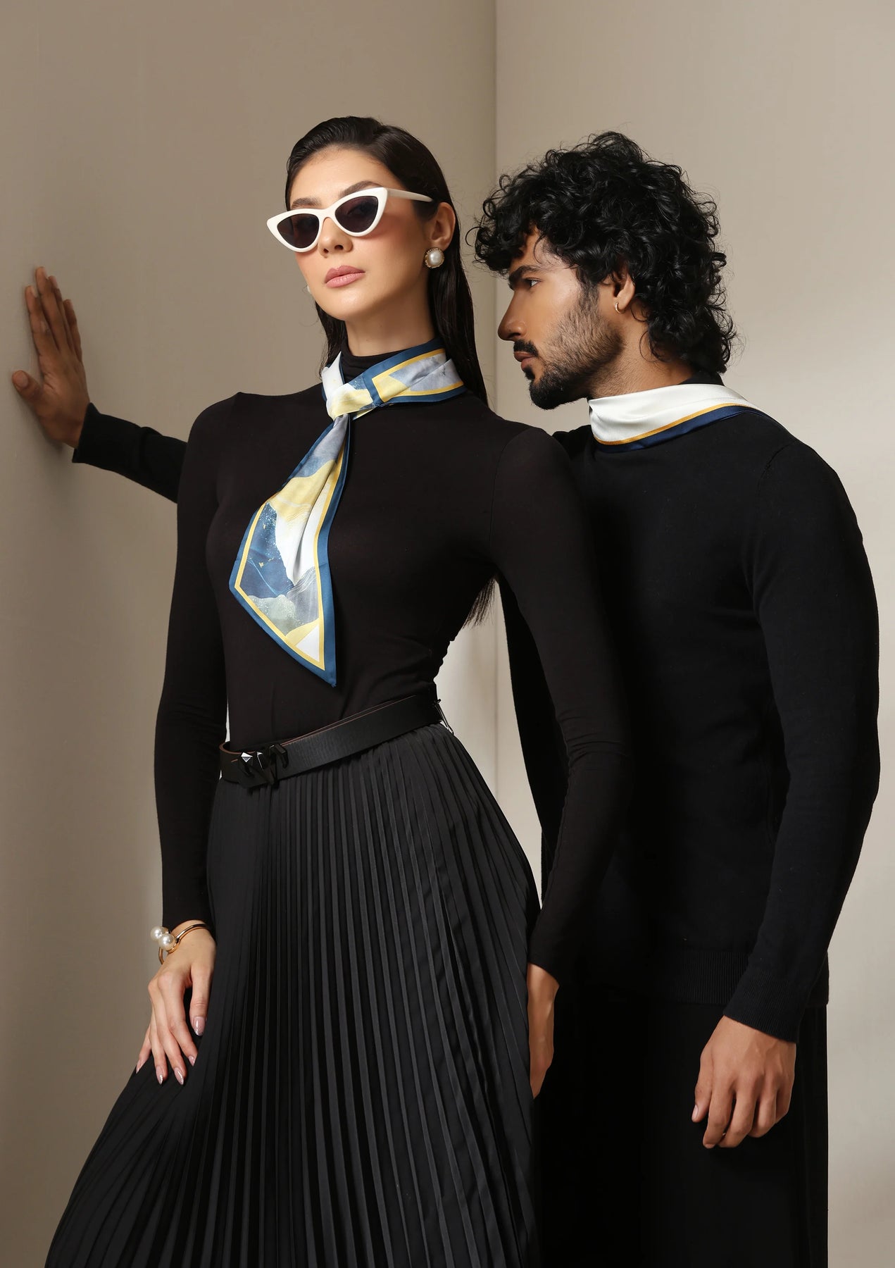 The Midnight Peaks Scarf is crafted in luxurious silk, featuring an artistic mountain-inspired print in deep midnight, gold, and ivory tones. Its fluid drape and lustrous finish make it an elegant accent for both men’s and women’s wardrobes. Perfect for evening wear, travel sophistication, or as a timeless luxury gift.