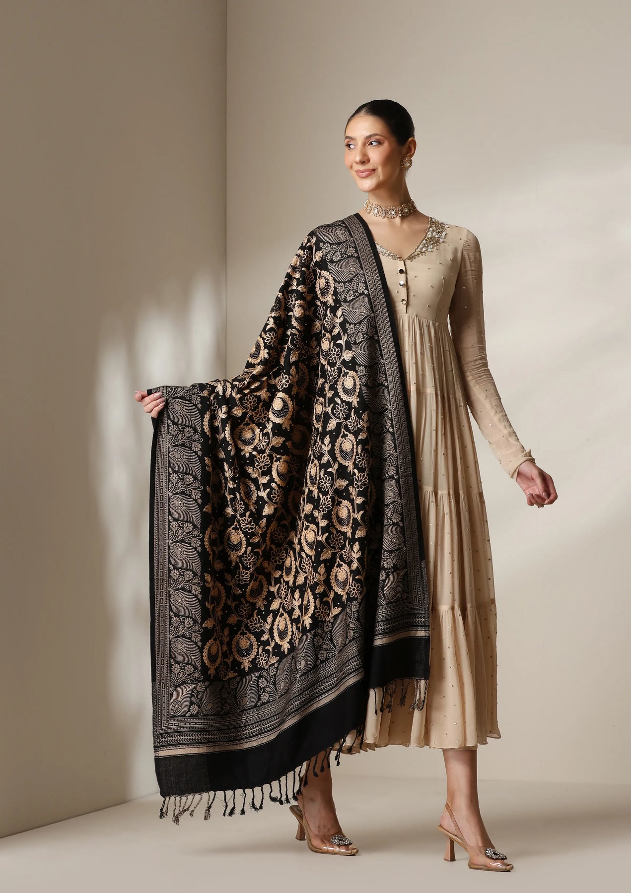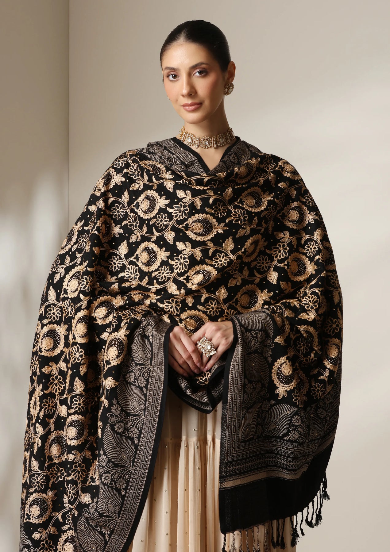 The Dusala Noir Luxe Shawl is a masterpiece of understated glamour, a celebration of craftsmanship and timeless luxury. Woven in ultra-soft fine wool, it features exquisite golden aari embroidery highlighted with delicate stonework that catches the light beautifully. The deep black base adds a regal charm, making it a versatile drape for both traditional and modern ensembles. Sized at 40 x 80 inches, it’s perfect for weddings, evening soirées, or as an elegant gift for someone special.