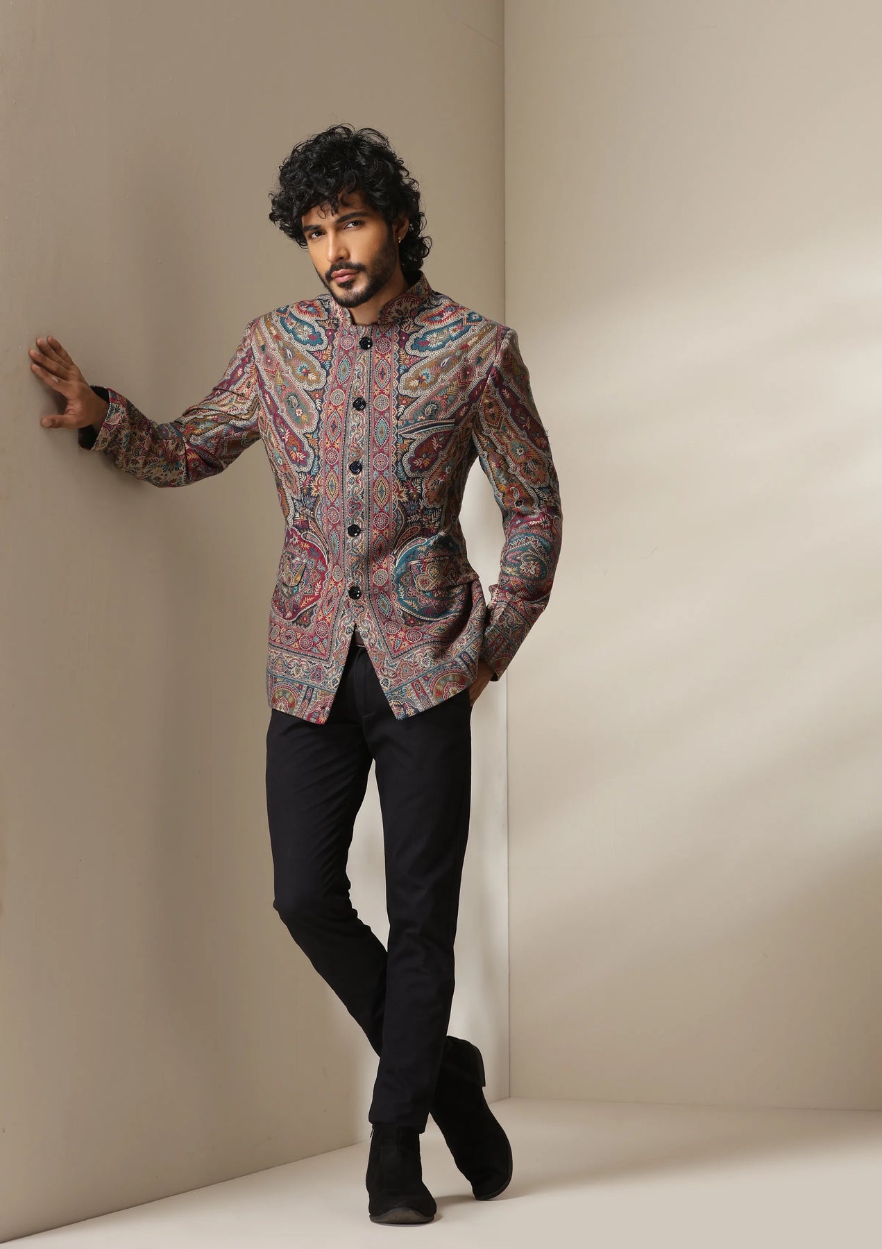 The Kashmir Royal Heritage Jacket by Dusala India embodies regal craftsmanship with a contemporary edge. Inspired by traditional Kashmiri paisleys and Persian motifs, this best-selling men’s wool bandhgala blazer merges rich maroon tones with accents of teal and antique gold — creating a look that is both ethnic and strikingly modern.