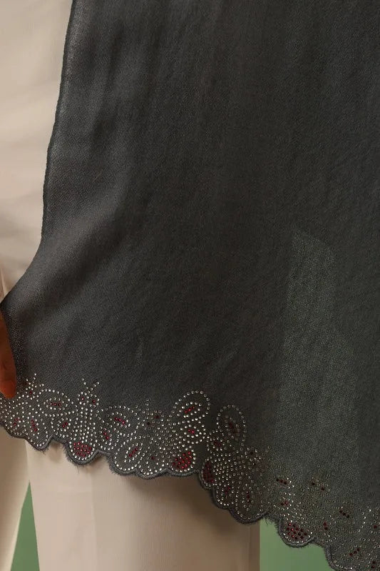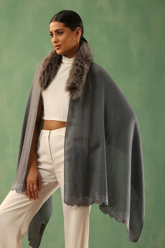 In grey Cashmere Fine Wool, the Mishty fur stole features premium collar fur and stone work. It offers classic elegance and warmth.
