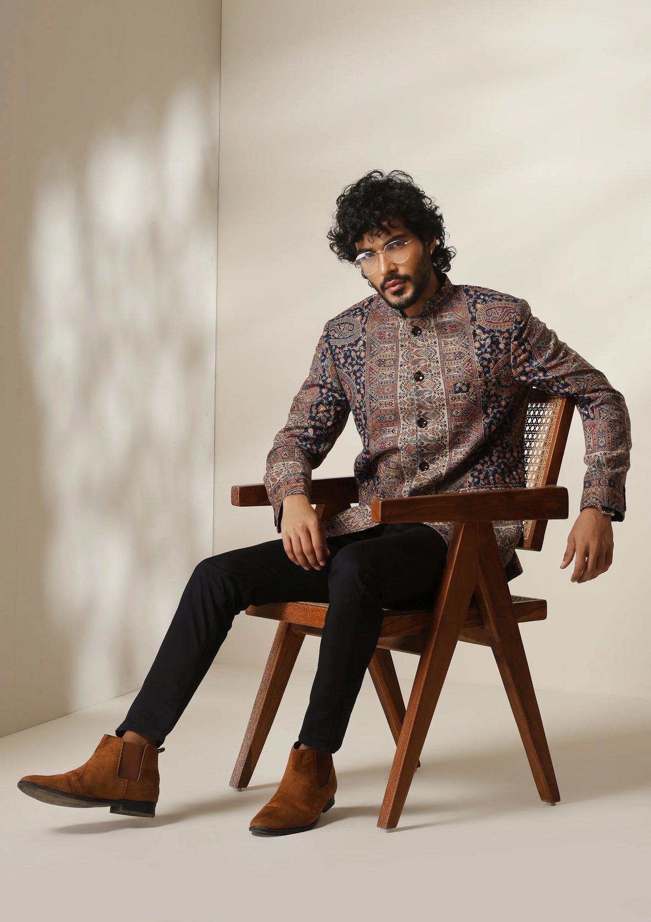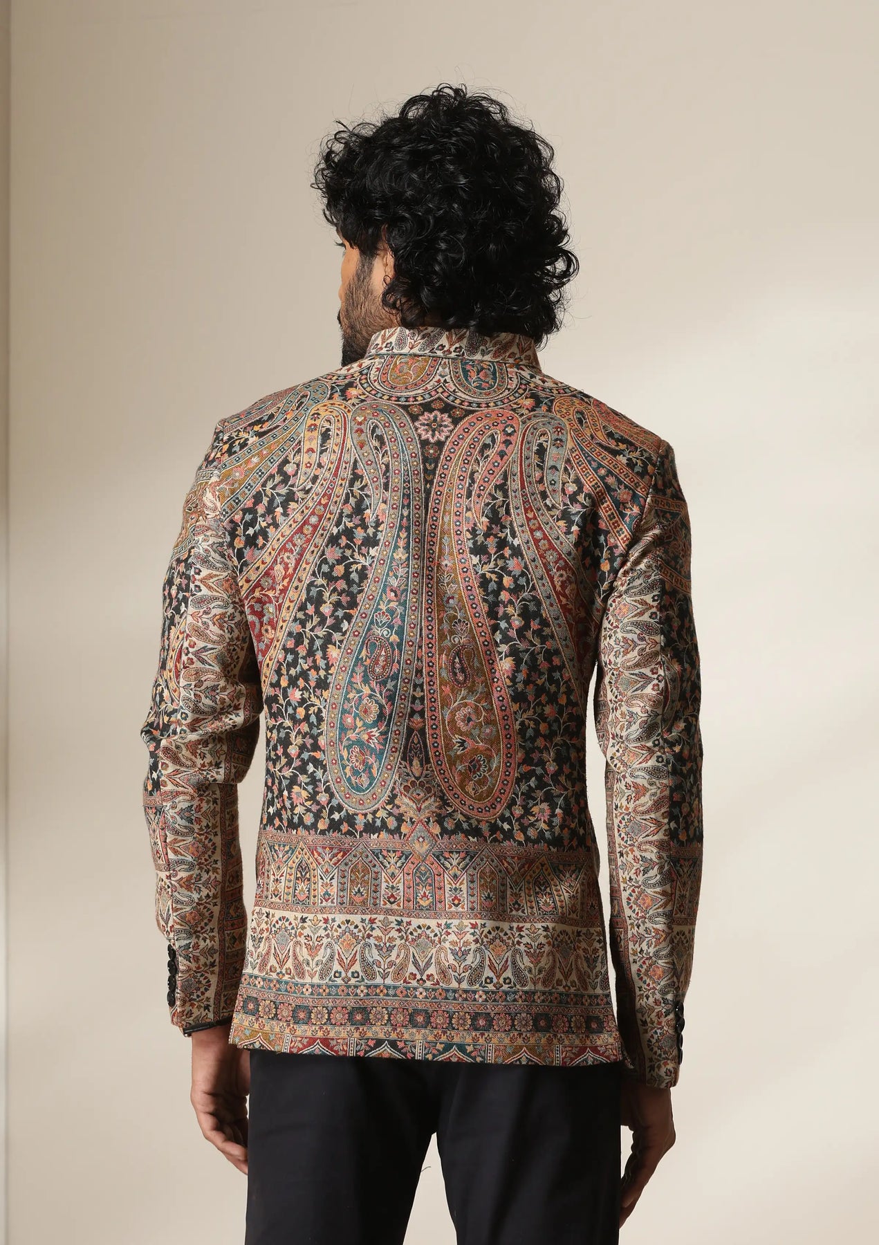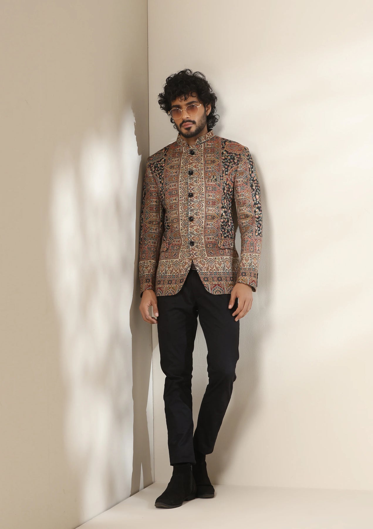The Regal Mosaic Wool Jacket by Dusala India captures the spirit of timeless craftsmanship and modern elegance. Featuring intricate Persian-inspired motifs in deep maroon, black, and antique beige, this best-selling men’s bandhgala blazer blends ethnic heritage with a refined, contemporary fit.