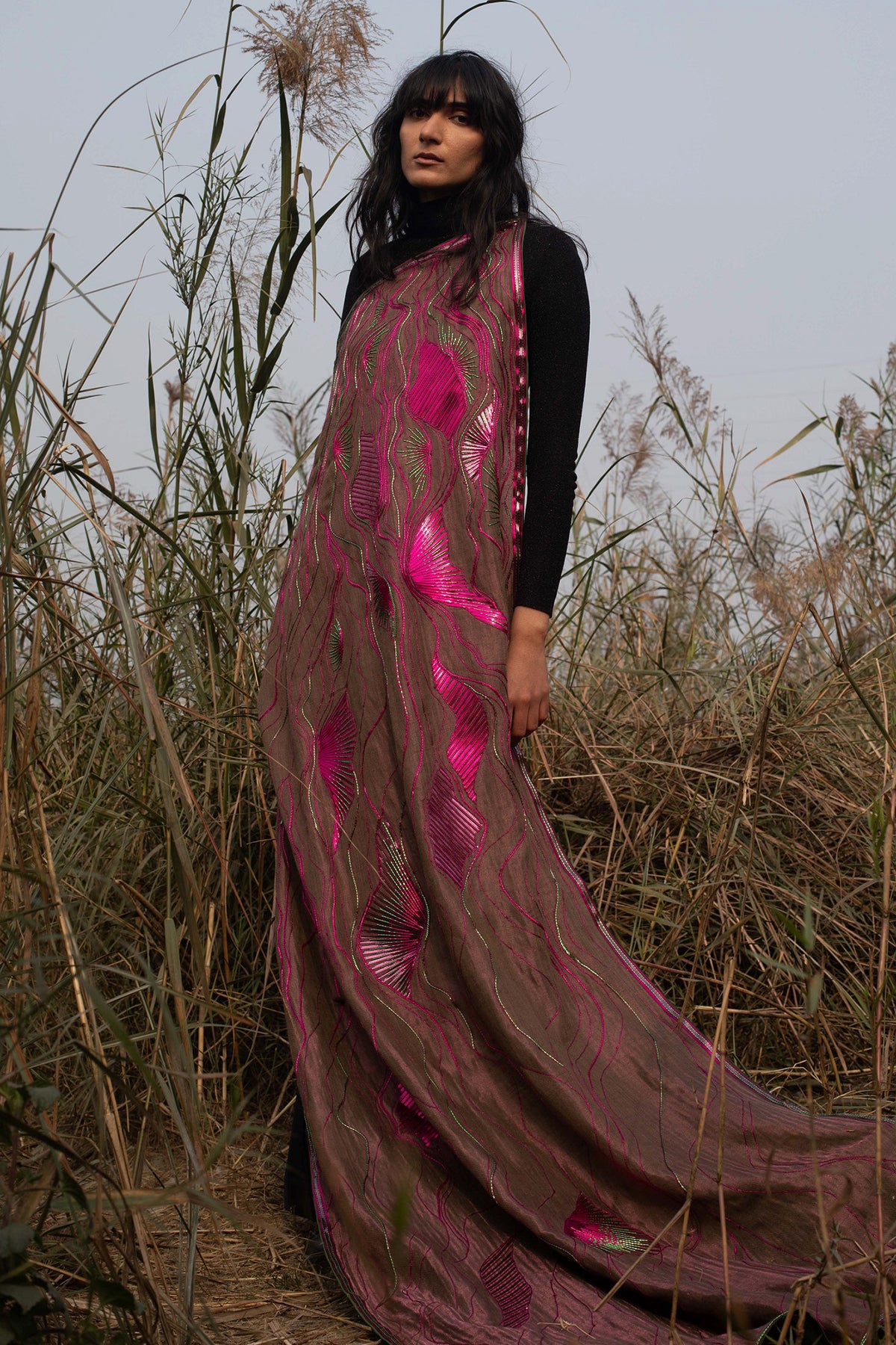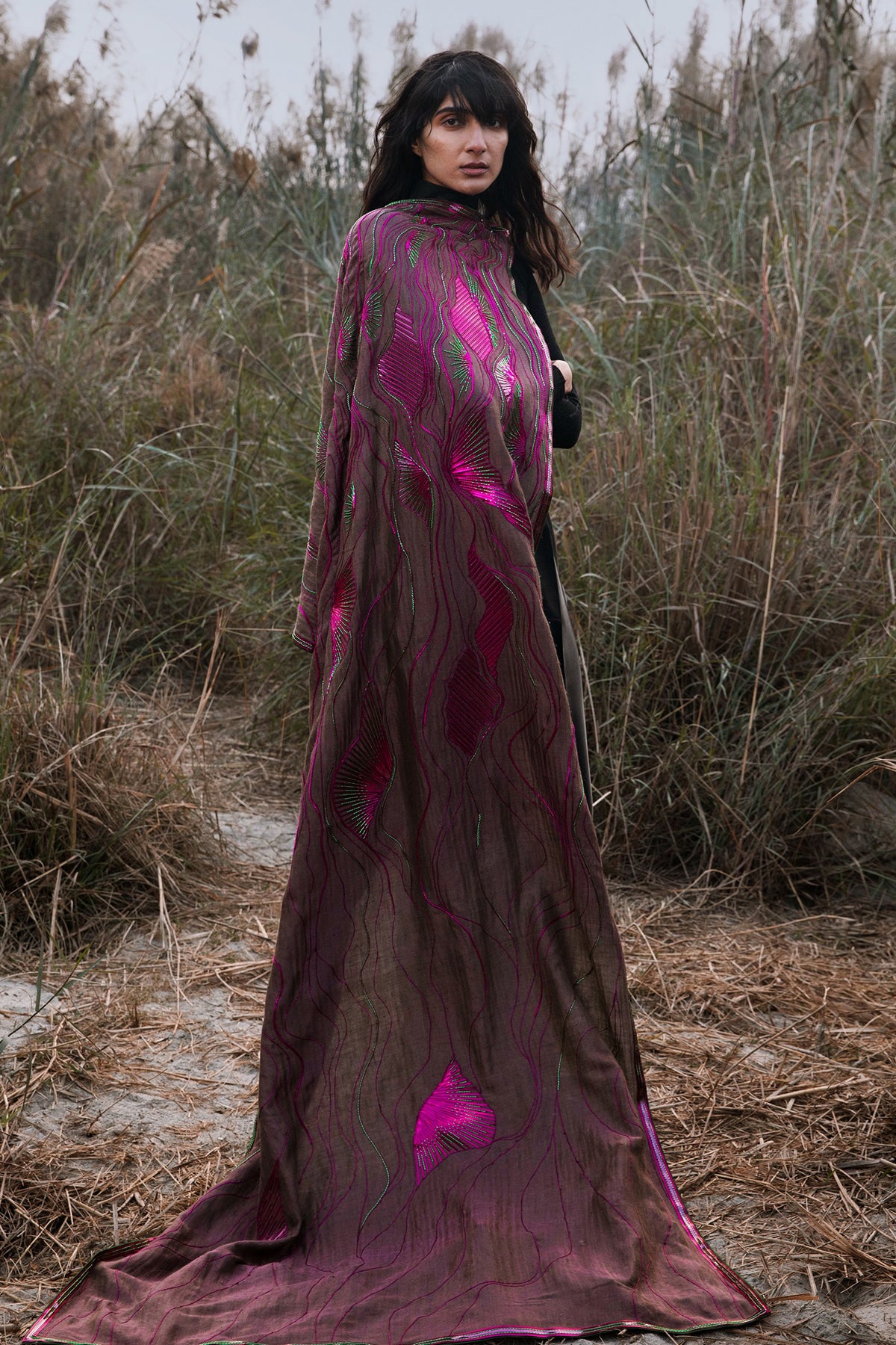 The SURKHI is handwoven pashmina zari reversible. Hand embroidery with polymer and metallic yarns sized 40x80inches. The fabric is soft, warm, and a greatoccasion wear.